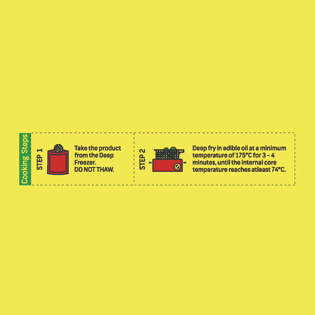 Deep fry: Deep fry in edible veg oil for 3 minutes at 360°F or 182°Cusing requisite frying equipment till internal core temperature of minimum 165°F or 74°C.