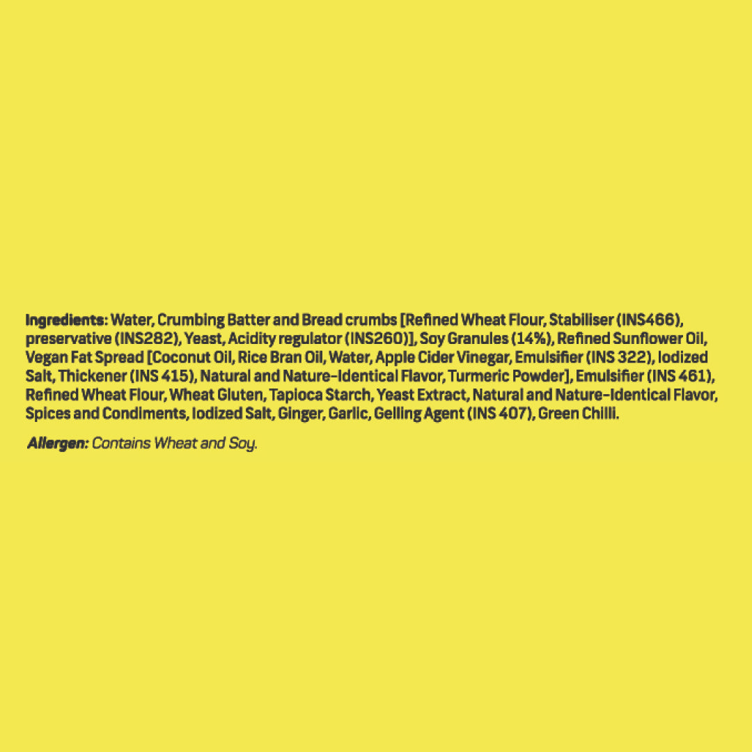Ingredients - Water (47.5%), Breadcrumbs {Refined Wheat Flour (Maida), Dextrose, Iodized Salt And Yeast}, Refined Palm Oil {Antioxidant (Ins 319)}, Textured Soy Protein Concentrate (8.7 %), Protein Blend Powder{Soy Protein Conc., Thickener (Ins 461), Yeast Extract, Dextrose}, Batter [Stabilizer (Ins 466)], Refined Sunflower Oil {Antioxidant (Ins 319)}, Spices And Condiments, Contains Added Flavour (Roasted Chicken Flavour), Yeast Extract, Iodized Salt {Anticaking Agent (Ins 536)}, Thickener (Ins 461) And Pea Protein.