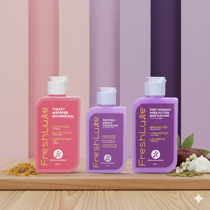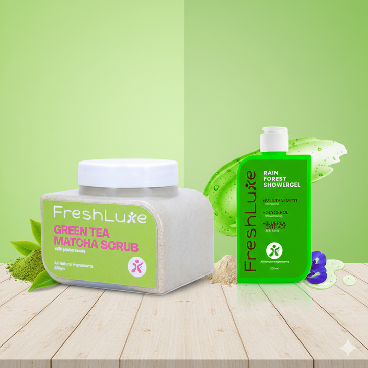 FreshLuxe Detan Combo | AYUSH-Approved | Shea Butter, Dead Sea Mud, Vitamin C & Lactic Acid | Body Lotion, Shower Gel & Scrub.