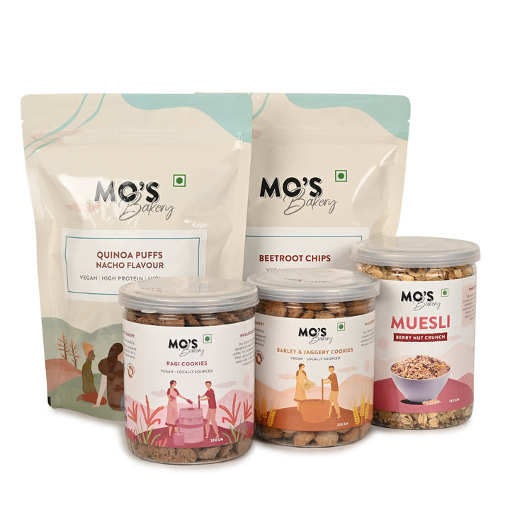 Their diverse range includes unique cookie flavors like Beetroot & Dark Chocolate, Almond Jaggery, Apple Cinnamon Oatmeal, and Raspberry Jam, alongside nutritious options like Energy Essentials snack packs featuring millet muesli, ragi chips, and quinoa puffs. All products are vegan, preservative-free, and made without refined sugar or palm oil, perfect for conscious snacking without compromising on taste.