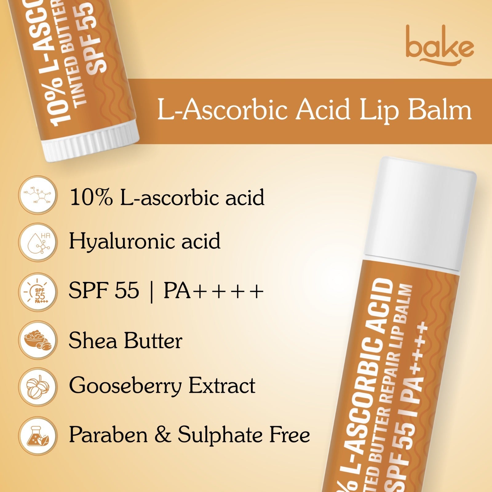 BAKE 10% L-Ascorbic Acid Tinted Butter Brightening Lip Balm SPF 55 PA++++ is the perfect daily lip care essential for dark, pigmented, dry, and chapped lips. Powered by 10% L-Ascorbic Acid (Vitamin C), it helps reduce lip pigmentation, brighten dull lips, and restore their natural color. The rich, buttery formula melts into the lips, providing 24-hour deep hydration to keep them soft and supple. With SPF 55 PA++++, this lip balm offers superior sun protection, shielding lips from harmful UVA/UVB rays and preventing further darkening. The tinted formula adds a sheer, natural wash of color, enhancing your lips while delivering nourishment. Suitable for both men and women, it repairs chapped lips, fights free radical damage, and prevents moisture loss, making it a must-have for healthy, glowing lips.