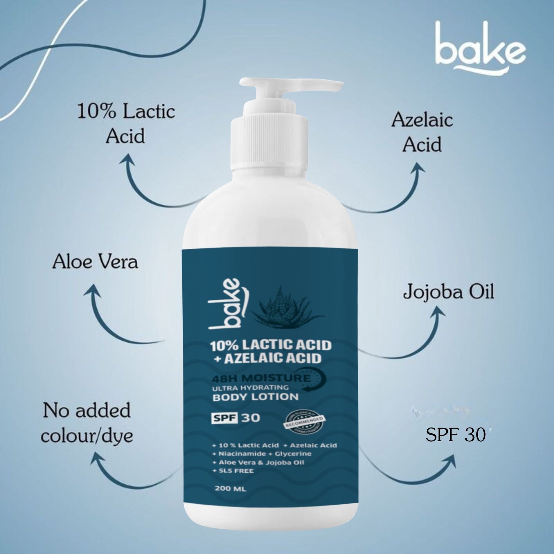 BAKE 10% Lactic Acid Body Lotion with Azelaic Acid is formulated to smooth rough, bumpy skin and provide deep hydration. The 10% lactic acid works as a gentle exfoliant, sloughing off dead skin cells to reveal softer, more radiant skin. Azelaic acid helps reduce body acne and redness, targeting blemishes and preventing future breakouts. This ultra-hydrating body lotion penetrates deeply to replenish moisture and improve skin texture, leaving your skin smooth, clear, and glowing. Lightweight yet effective, it's perfect for daily use to maintain soft, healthy skin.