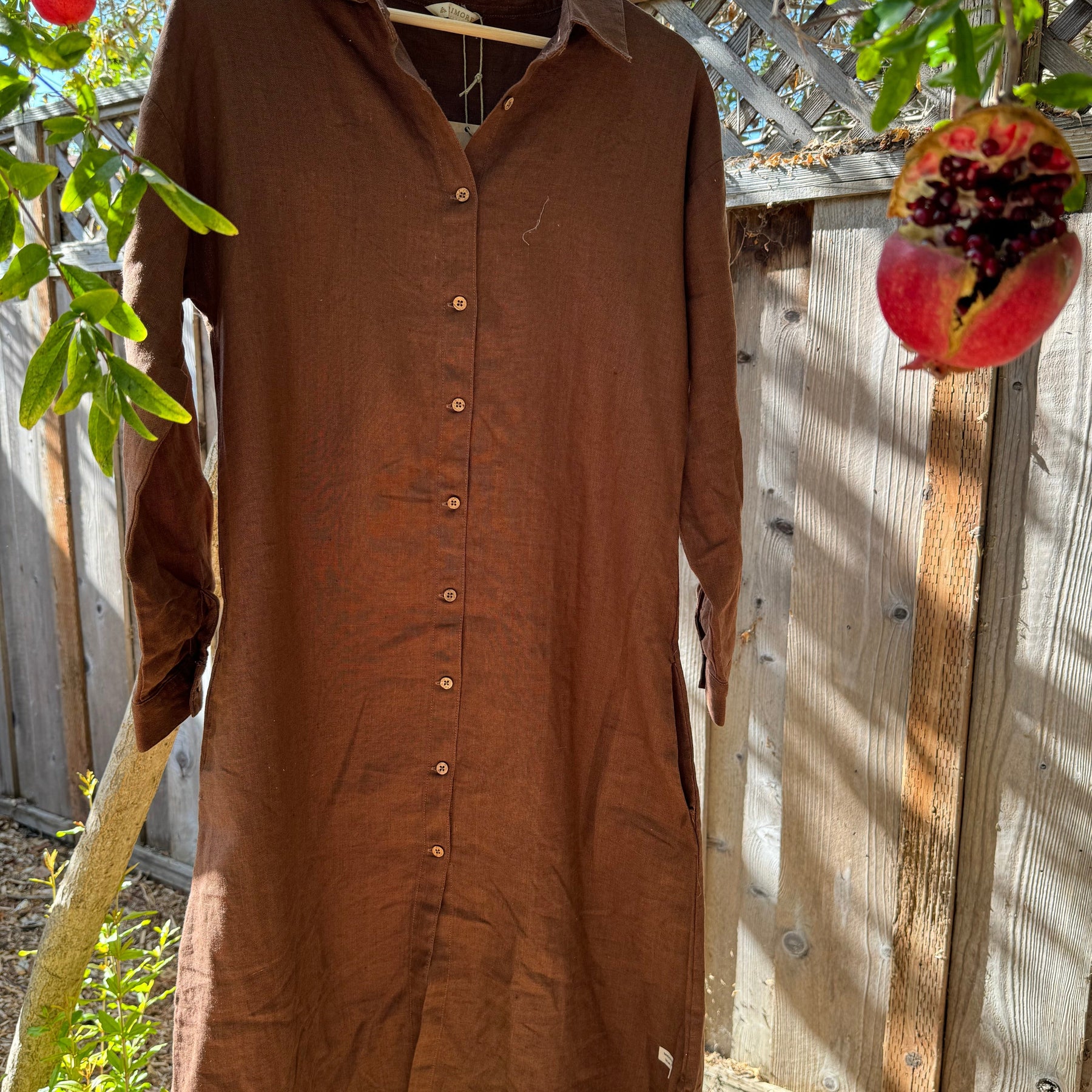 Crafted from 100% premium linen, this long linen dress for women is tailored for taller women who want length, ease, and elegance in one piece. Designed with a relaxed yet refined silhouette, it features side pockets for practicality and a knee-length slit that adds just the right touch of movement and style.