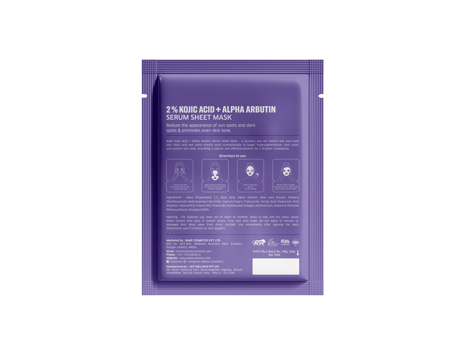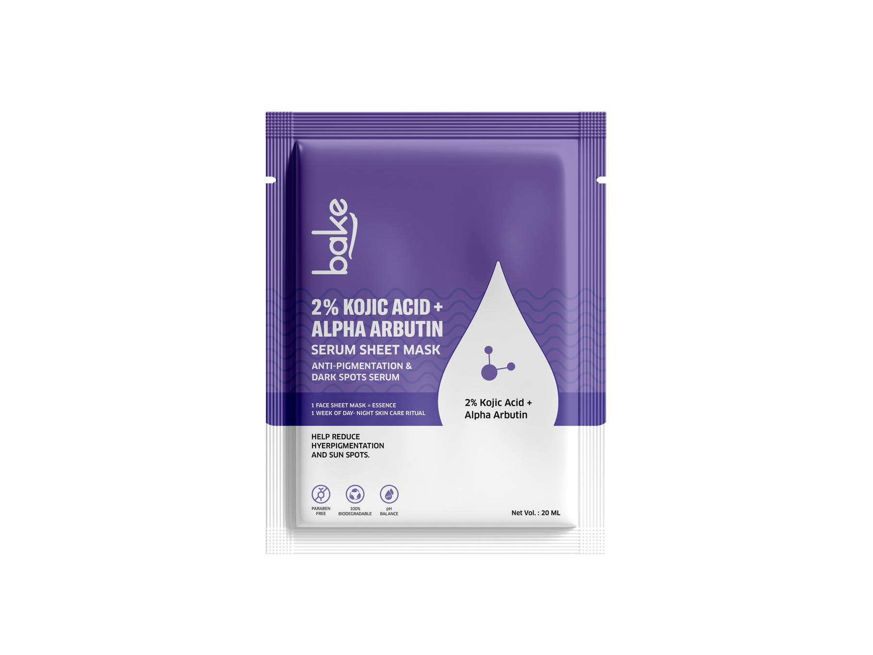 BAKE 2% Kojic Acid + Alpha Arbutin Serum Sheet Mask, scientifically formulated to target & treat dark circles, spots, and pigmentation concerns. Infused with a potent blend of 2% Kojic Acid and Alpha Arbutin, the serum mask effectively combats hyperpigmentation, promoting an even skin tone and a brighter complexion. Say goodbye to tan lines as this mask gently helps in tan removal, unveiling smoother, more radiant skin. Moreover, our formula is free from parabens, ensuring a safer and gentler skincare experience. Embrace eco-conscious beauty with our 100% biodegradable sheet mask, suitable for all genders seeking luminous, healthier-looking skin.