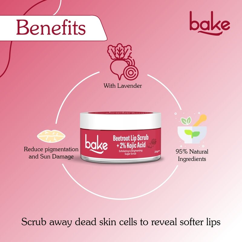 Brighten and rejuvenate your lips with BAKE 2% Kojic Acid Beetroot Lip Scrub, specially crafted to reduce pigmentation and reveal soft, pink lips. Infused with 2% Kojic Acid, it effectively lightens dark lips while sugar granules gently exfoliate dead skin, leaving your lips smooth, hydrated, and plump. Enriched with beetroot extracts, this scrub soothes and nourishes dry, chapped lips, adding a calming touch to your lip care routine. Designed for men and women of all lip types, this 25g lip scrub is perfect for everyday use. Its dermatologist-recommended formula ensures safe and effective exfoliation, making it the ultimate solution for soft, naturally bright, and even-toned lips.