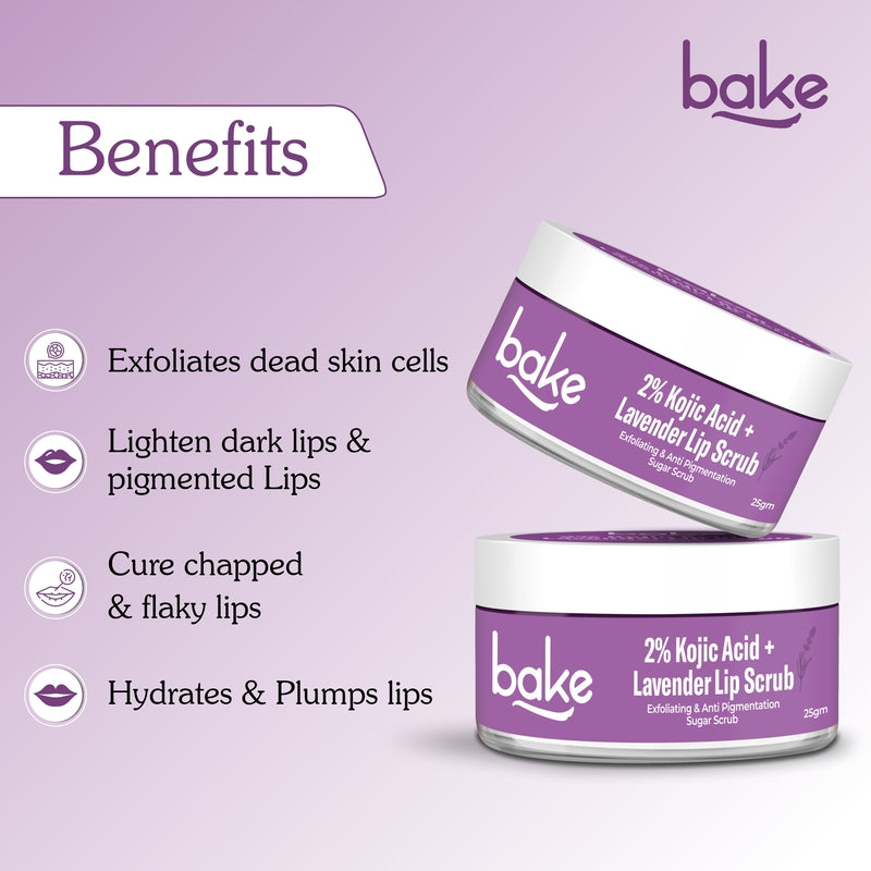 Brighten and rejuvenate your lips with BAKE 2% Kojic Acid Lavender Lip Scrub, specially crafted to reduce pigmentation and reveal soft, pink lips. Infused with 2% Kojic Acid, it effectively lightens dark lips while sugar granules gently exfoliate dead skin, leaving your lips smooth, hydrated, and plump. Enriched with lavender extracts, this scrub soothes and nourishes dry, chapped lips, adding a calming touch to your lip care routine. Designed for men and women of all lip types, this 25g lip scrub is perfect for everyday use. Its dermatologist-recommended formula ensures safe and effective exfoliation, making it the ultimate solution for soft, naturally bright, and even-toned lips.