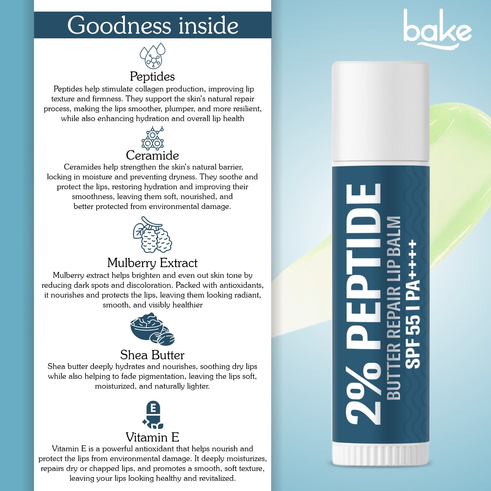 BAKE 2% Peptide + Ceramide Butter Brightening Lip Balm SPF 55 PA++++ is a deeply nourishing formula designed to repair, protect, and brighten dark, pigmented, dry, and chapped lips. Infused with 2% Peptides, it helps boost collagen production, making lips appear plumper and healthier, while Ceramides strengthen the lip barrier to lock in moisture for 24-hour hydration. This buttery lip balm melts effortlessly into the lips, providing intense nourishment and repairing damaged, flaky skin. With SPF 55 PA++++, it shields lips from harmful UVA/UVB rays, preventing further darkening and sun damage. Perfect for both men and women, this lip balm restores softness, smooths rough texture, and keeps lips hydrated all day without a sticky feel.