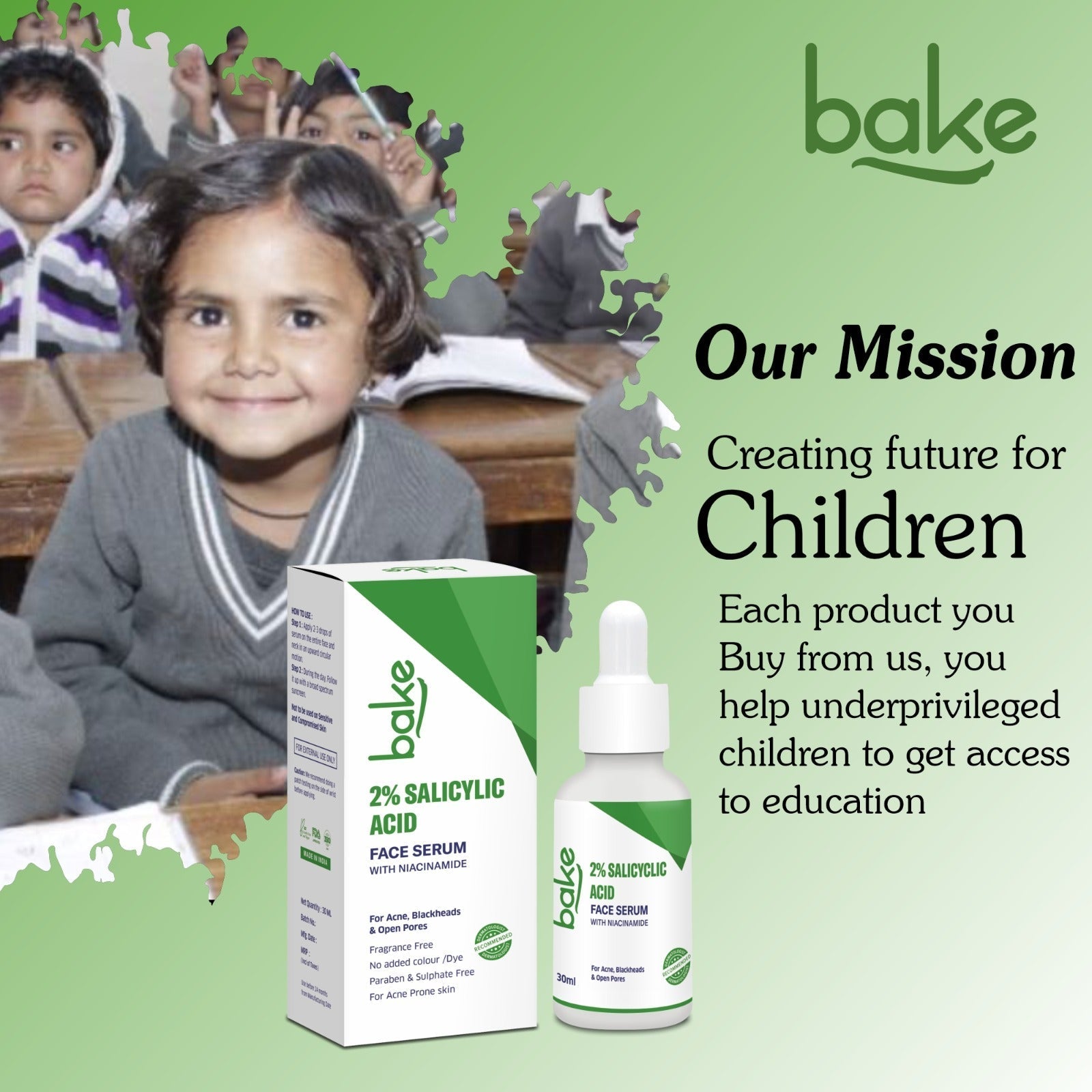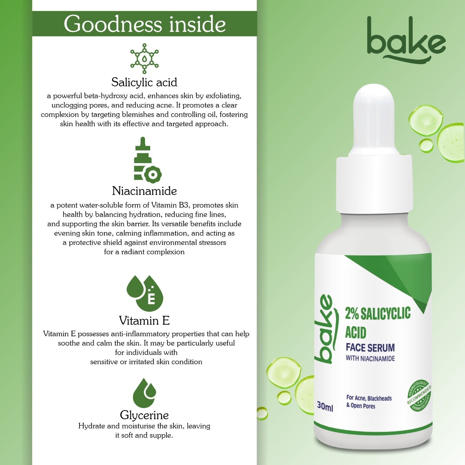 BAKE 2% Salicylic Acid Face Serum is a potent exfoliating serum designed to combat acne, blackheads, whiteheads, and clogged pores. Its potent properties penetrate deep into the skin, preventing future breakouts and promoting a clearer complexion. Niacinamide reduces inflammation and improves skin barrier function.