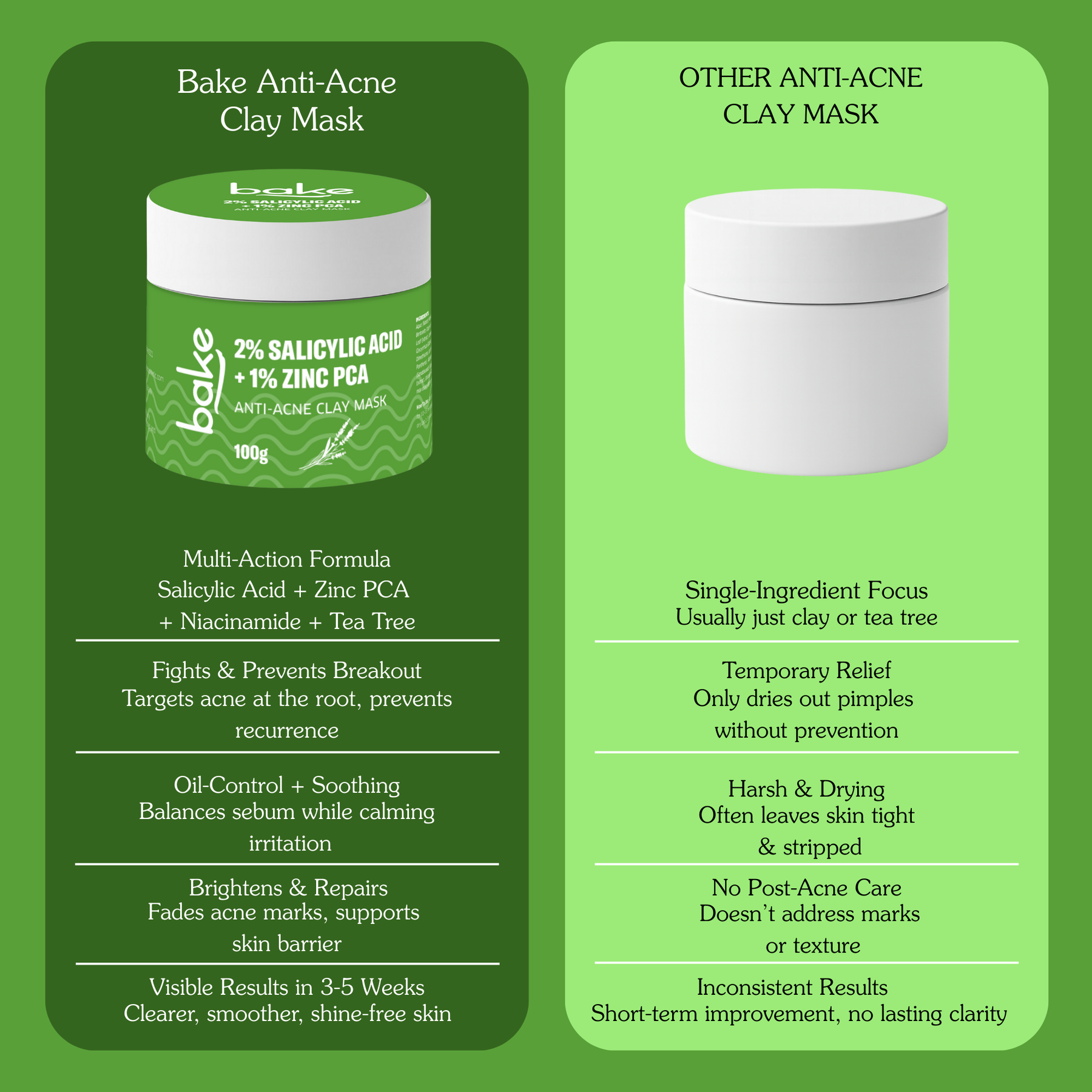 Bake 2% Salicylic Acid + 1% Zinc PCA Anti-Acne Clay Mask is a powerful yet gentle treatment formulated to combat acne, clogged pores, and excess oil. Enriched with 2% Salicylic Acid, it penetrates deep into pores to remove impurities, fight breakouts, and prevent future acne. The added 1% Zinc PCA helps regulate sebum production, minimize shine, and soothe inflammation, leaving skin refreshed and balanced. This clay-based formula draws out toxins, tightens pores, and improves skin clarity without stripping essential moisture. Suitable for oily, acne-prone, and combination skin, it works to reduce blemishes, blackheads, and redness while promoting a clearer, smoother, and healthier-looking complexion.