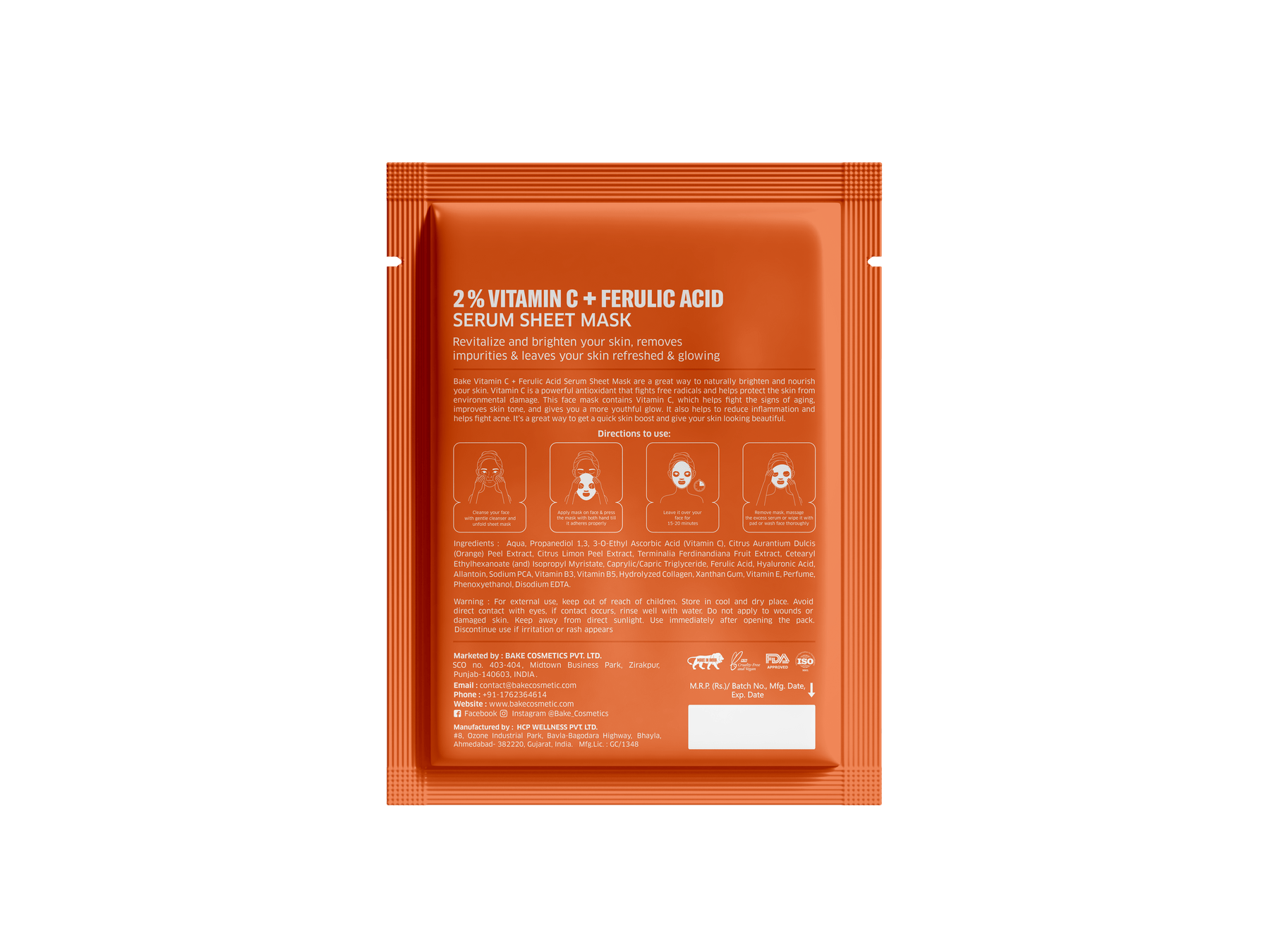 BAKE 2% Vitamin C + Ferulic Acid Serum Sheet Mask, meticulously formulated to target dark spots and pigmentation. Formulated with potent Vitamin C and Ferulic Acid, this mask delivers a powerful antioxidant boost to combat hyperpigmentation and promote a more even skin tone. Free from parabens and harsh chemicals, it offers a safe and gentle solution for brightening and revitalizing the skin. What's more, our mask is made from 100% biodegradable materials, making it an environmentally conscious choice for achieving a radiant glow. Experience the transformative benefits of our Vitamin C + Ferulic Acid Serum Sheet Mask and unveil luminous, healthier-looking skin.