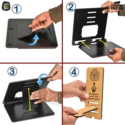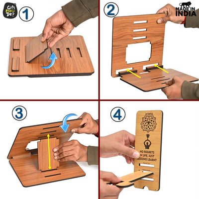 Apart from holding Mobile phones in both horizontally and vertically, we can also place tablets and music sheets. It looks simple and handy, but it's a lot more affordable. Best gift choice for all, especially office staff, students, work from home, etc Made from natural hard Indian wood, this mobile holder is quite solid and provides absolute stability. The solid build of the stand prevents the charger from sliding. An ideal addition to one’s décor & a delightful gift option too.
