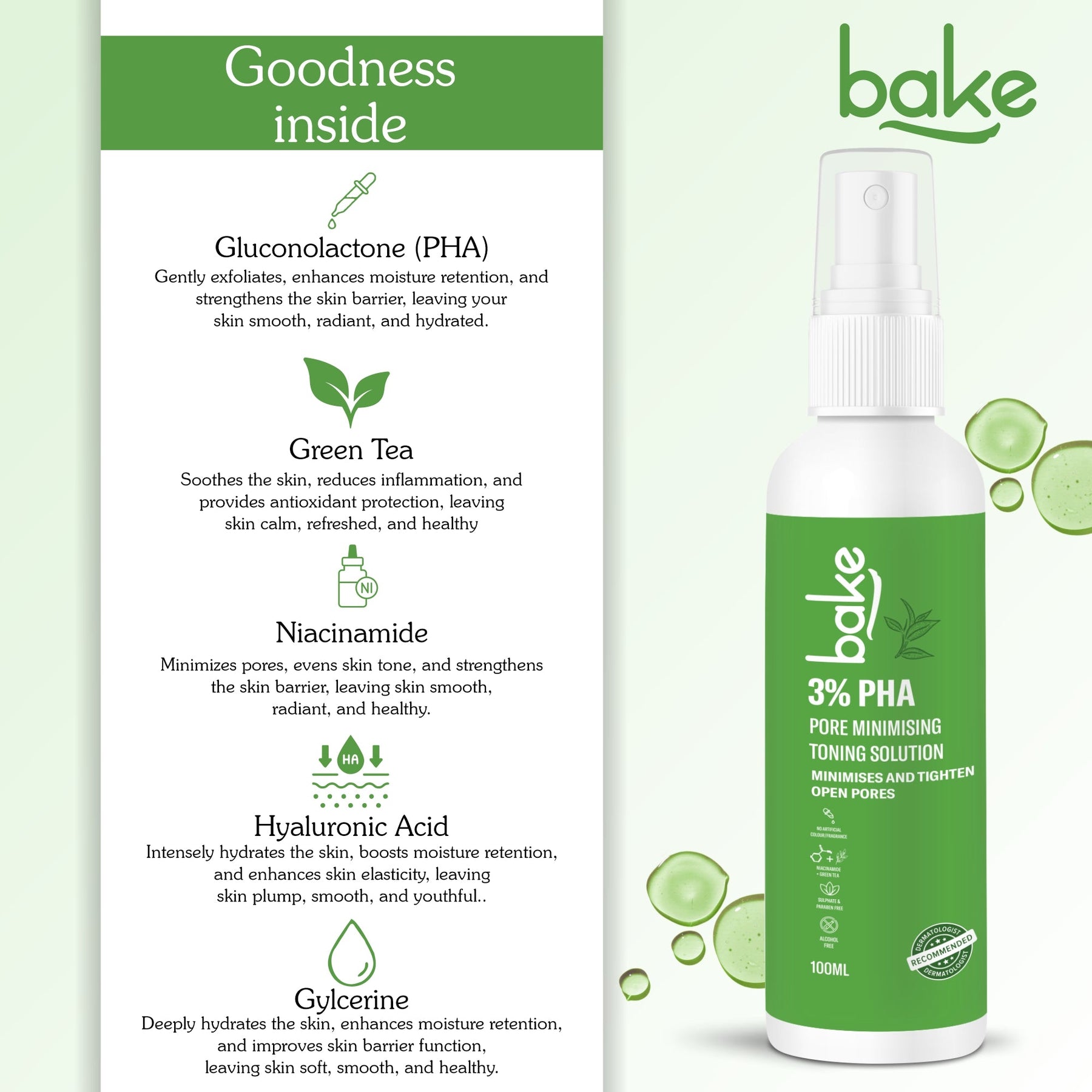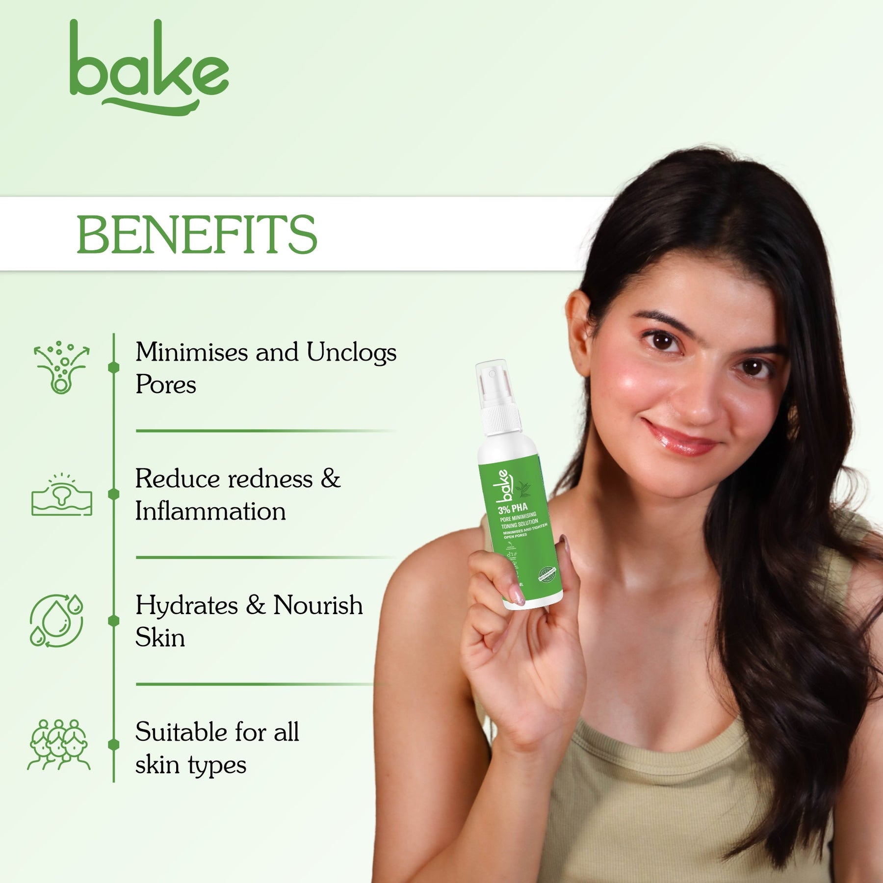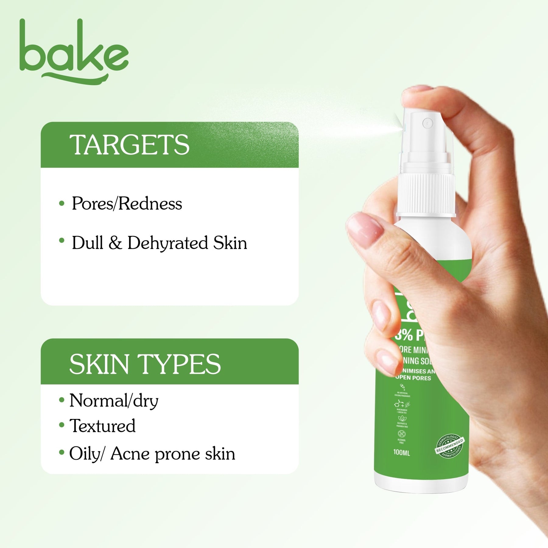 BAKE 3% PHA Toner is formulated to minimize and tighten open pores while effectively managing acne and oil control. This toner contains Gluconolactone, a gentle PHA that exfoliates the skin, promoting smoother texture and cell renewal without causing irritation, making it suitable for all skin types. The addition of Niacinamide helps to refine pores, balance oil production, and reduce inflammation, resulting in a clearer, more matte complexion. With consistent use, you'll notice visibly tighter pores and a significant improvement in overall skin clarity.