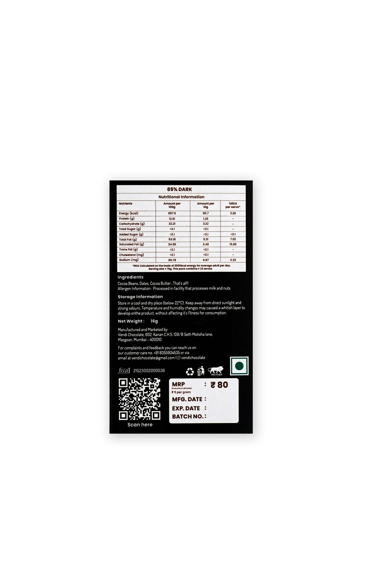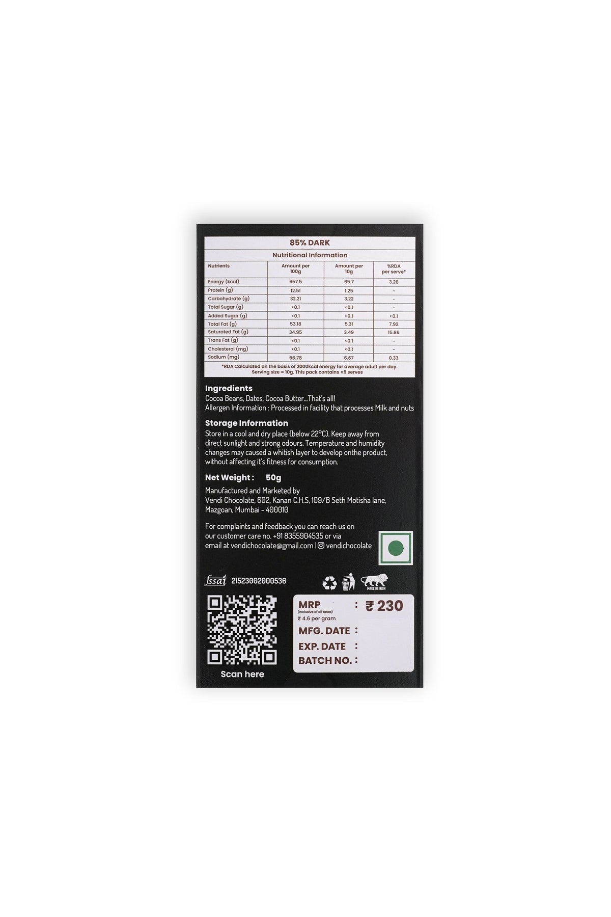 Discover the bold and intense flavor of our 85% Dark Chocolate, crafted with 85% cocoa content and a touch of natural sweetness from dates. Handcrafted from bean to bar, this guilt-free indulgence offers a rich taste experience while packing a nutritional punch with antioxidants and essential minerals. Satisfy your chocolate cravings and nourish your body with every decadent bite of this wholesome treat.