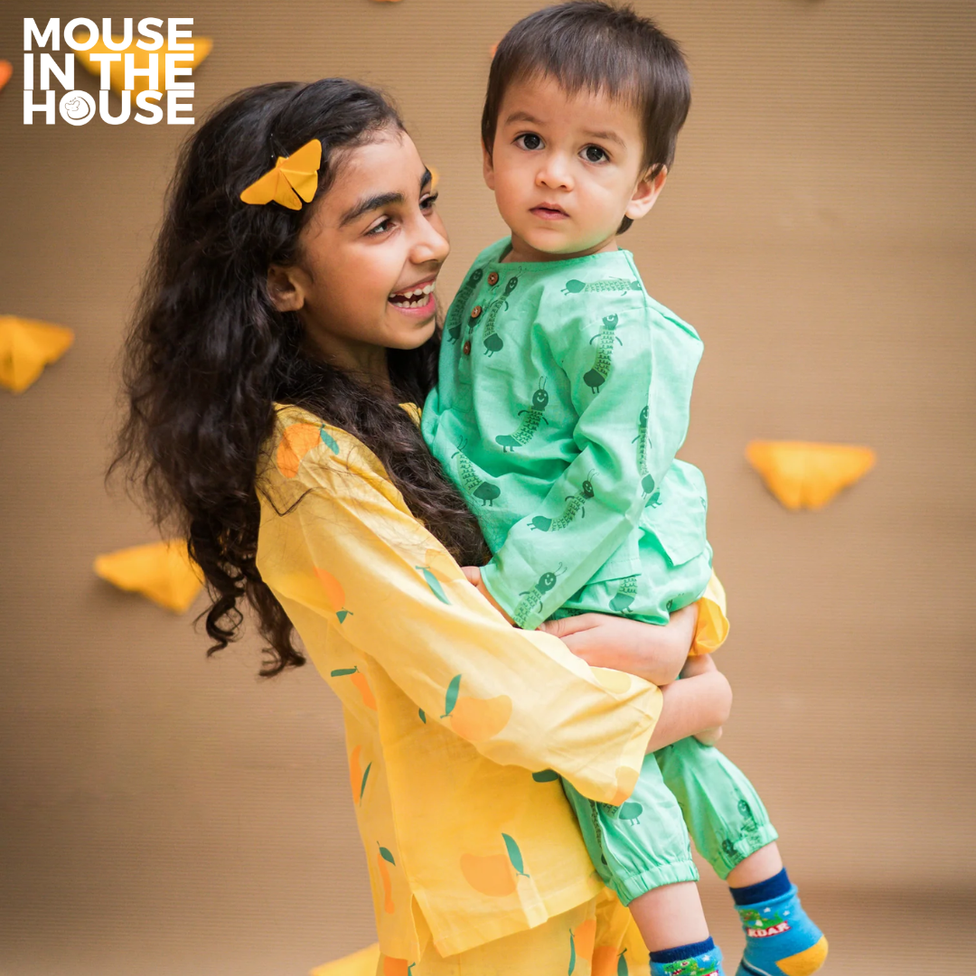 Let bedtime be a sweet escape with our Juicy Mango Unisex Nightdress! 🥭 Made from 100% soft cotton, this lightweight and breathable nightwear is adorned with vibrant illustrations of 'The Hungry Caterpillar' and his colorful feast. With playful prints and cozy fabrics, bedtime becomes an adventure as little ones drift into dreamland surrounded by their favorite storybook characters.