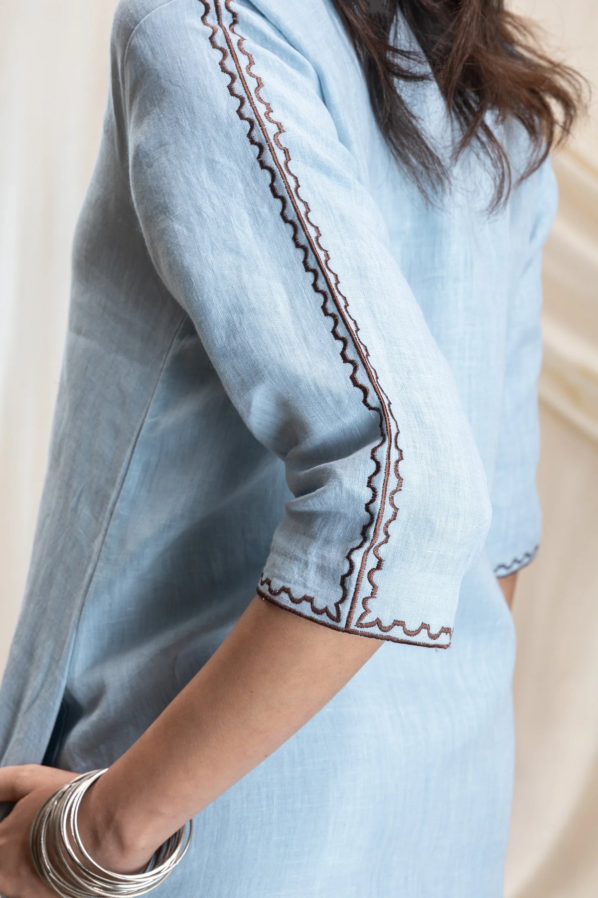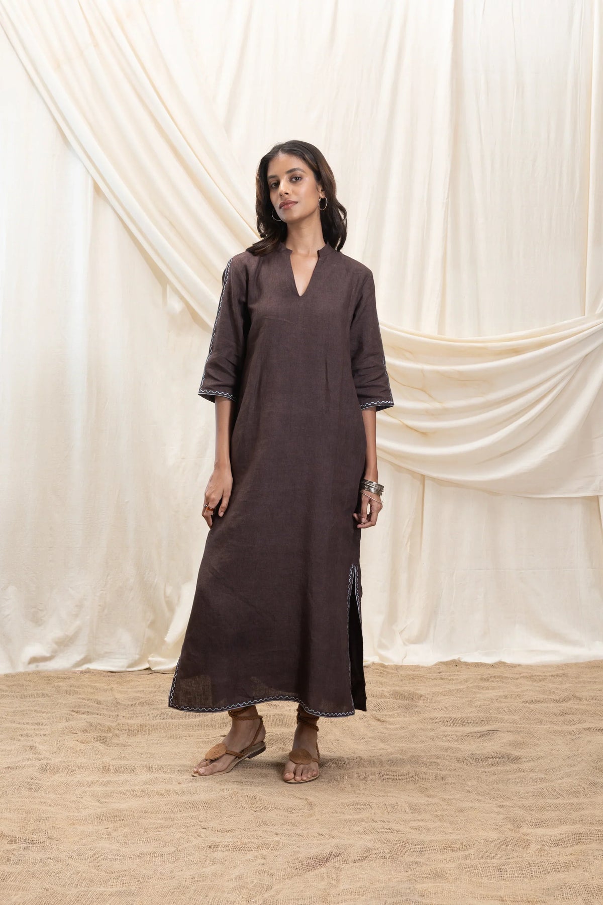 An effortlessly stylish full-length dress designed for comfort and ease. It features practical pockets on both sides and a bold thigh-high slit, beautifully highlighted with our signature line embroidery in a contrasting shade. The 3/4th sleeves, extending till the elbow, are also adorned with delicate line embroidery for a refined touch. A classic mandarin collar adds to its understated elegance, making this piece a perfect blend of simplicity and sophistication.
