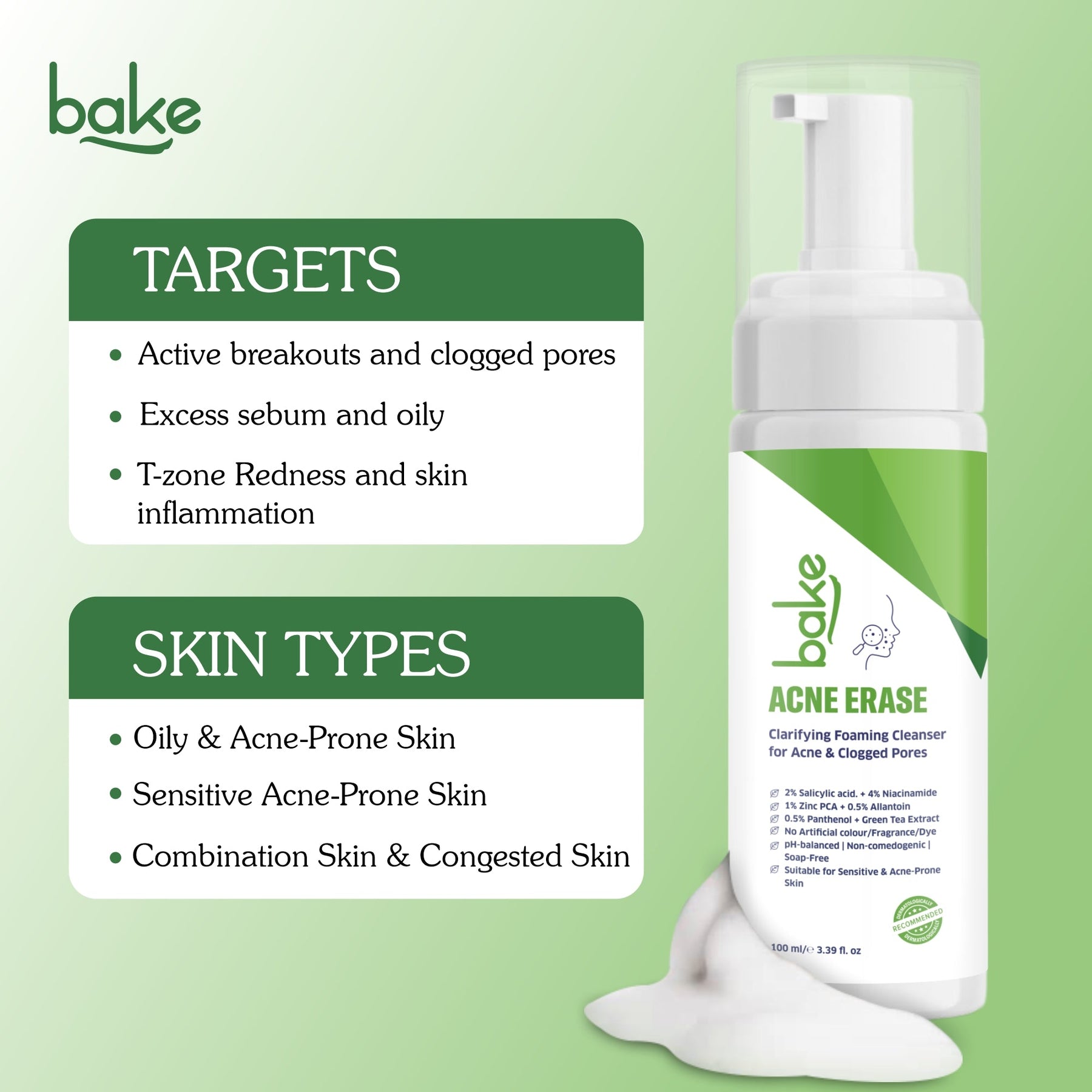 BAKE Acne Erase Foaming Face Wash is a gentle yet powerful clarifying cleanser formulated for oily, acne-prone, and sensitive skin which reduces stubborn acne and clogged pores. Enriched with 2% Salicylic Acid and 4% Niacinamide, it penetrates deep into pores to dissolve excess oil, remove dirt, and fight active breakouts. The lightweight foam texture cleanses effectively without stripping your skin’s natural barrier. This formula is boosted with Zinc PCA, and Green Tea Extract to control sebum production, calm irritation, and reduce redness, leaving your skin refreshed and balanced. Unlike harsh cleansers, it is soap-free, fragrance-free, and dye-free, making it safe for everyday use. Whether you’re struggling with blackheads, whiteheads, or recurring acne, BAKE Acne Erase helps minimize future breakouts while fading blemishes. Its non-comedogenic and pH-balanced formula ensures that pores remain unclogged and skin feels soft, smooth, and healthy. Perfect for men and women, this foaming cleanser is your daily step towards clear, radiant, and acne-free skin.