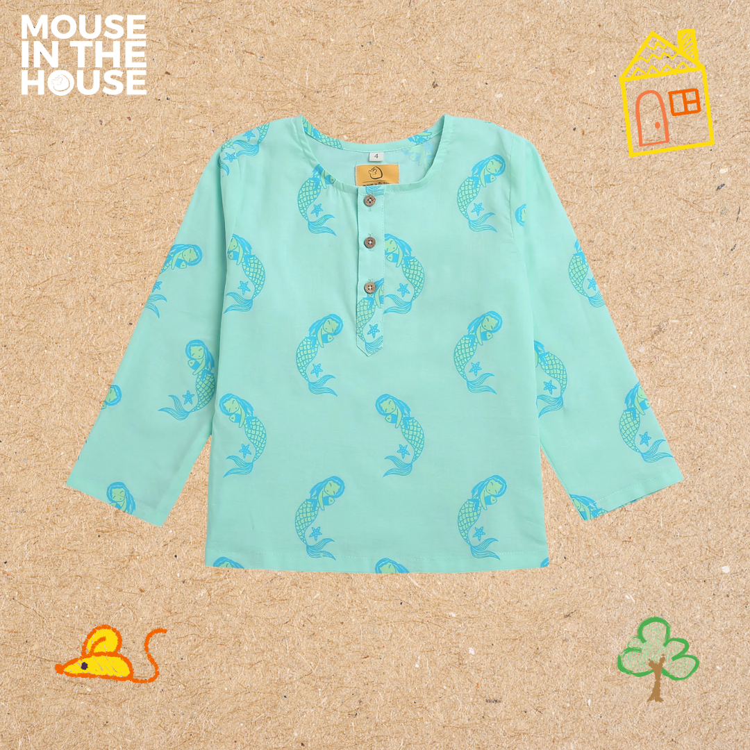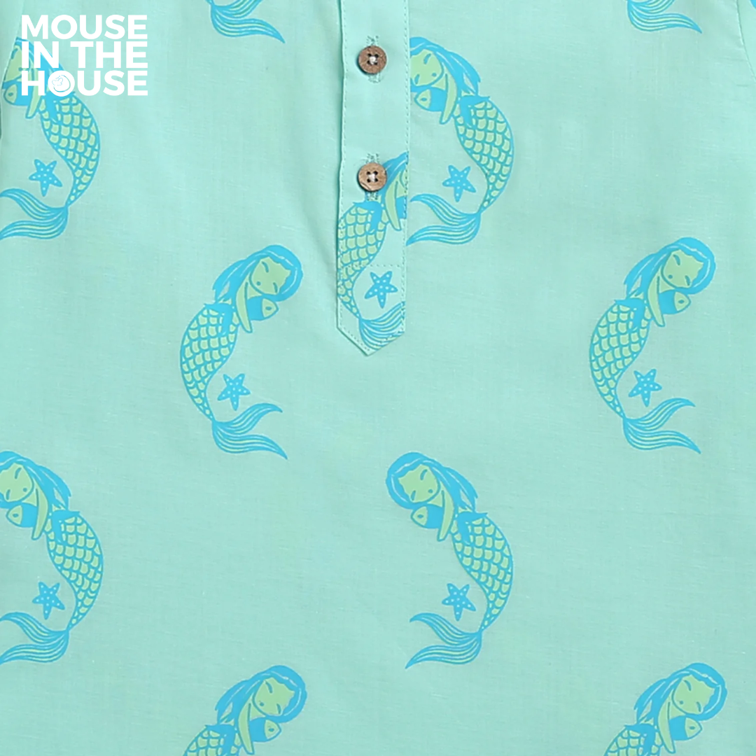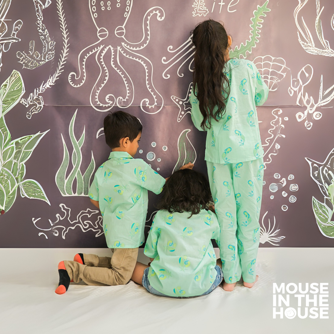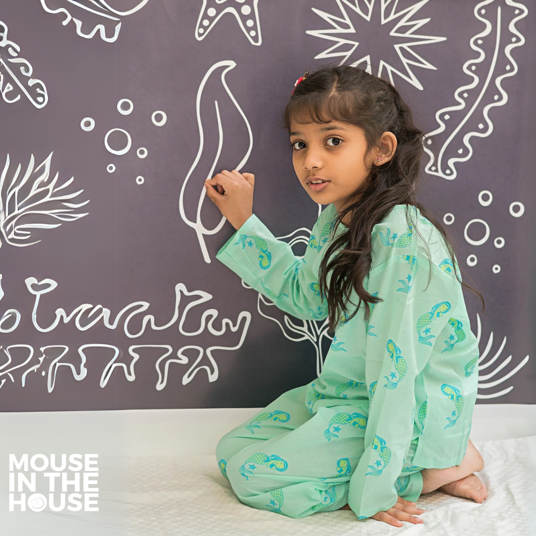 Drift off to dreamland wrapped in the magic of the sea with our ocean-inspired pajama set! Adorned with playful mermaid prints, these soft and breathable cotton PJs bring comfort and adventure to bedtime. Let your little one dive into a world of underwater dreams, where mermaids dance and waves whisper lullabies.