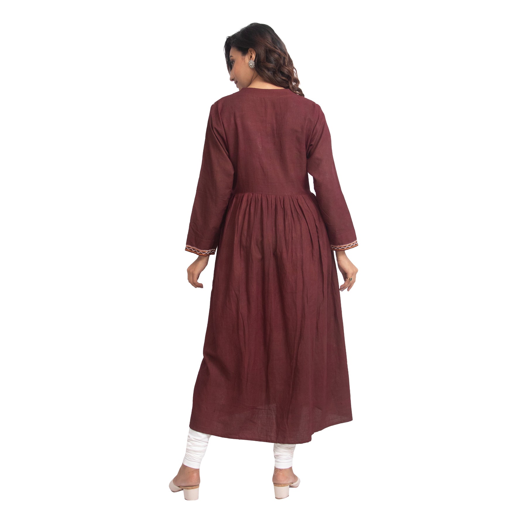 Adya Brown Rebari Khadi Kurti is a gorgeous ensemble, crafted from the best quality fabric. The white kurti is dyed in deep brown color which is the perfect vibrant color and rebari work that looks so classy and dashing on you. Perfect for occasions and gives a festival look with long jhumnka.