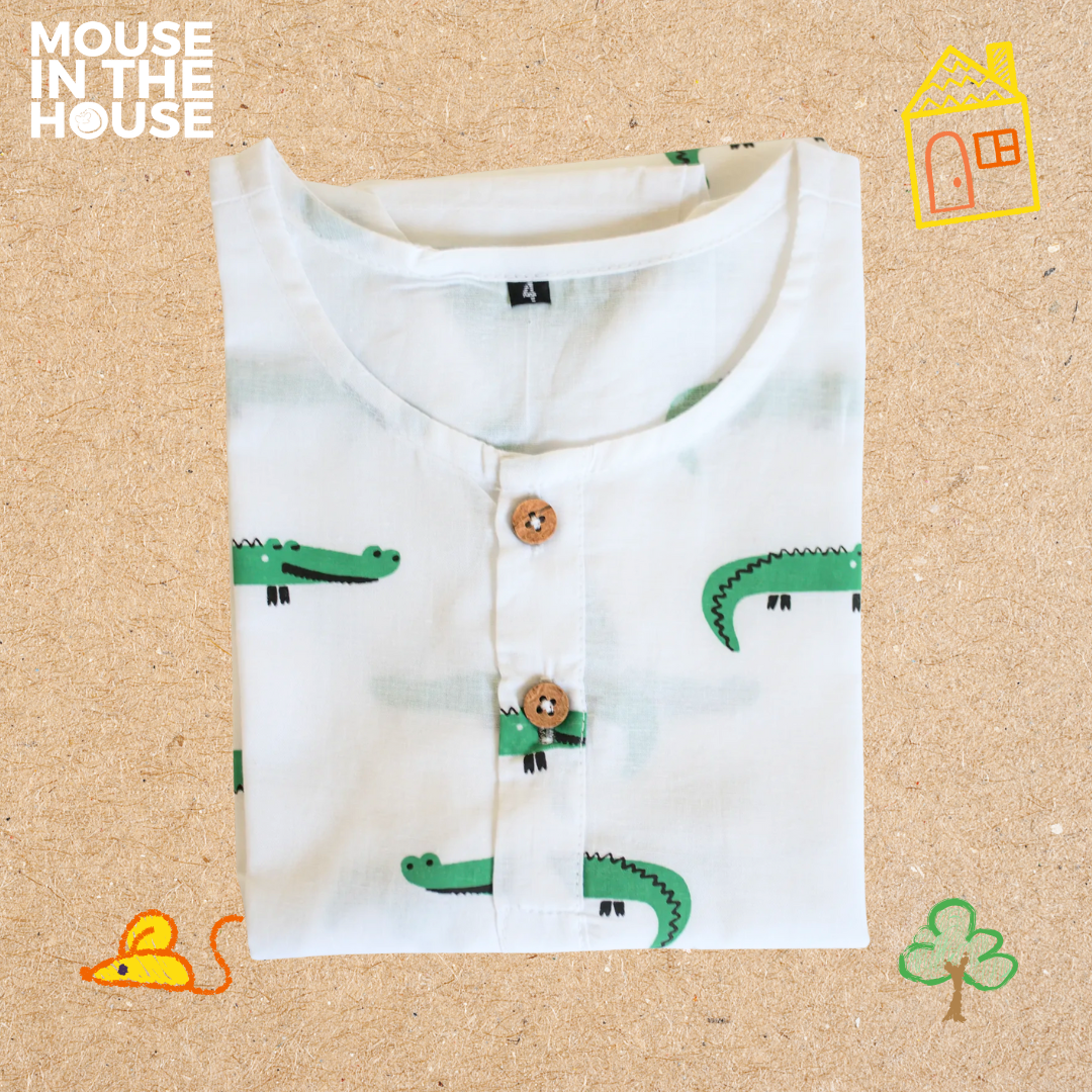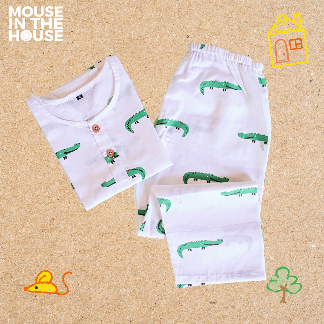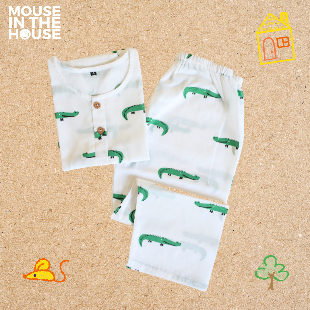For little Mouselings who love adventure, our Crocodile Print Nightdress is designed to keep up with their wild imaginations! From playtime to dreamtime, this breathable cotton outfit is a perfect second skin for all seasons. Light, airy, and oh-so-soft – it's bedtime made better!