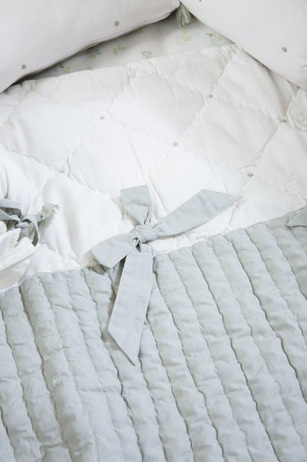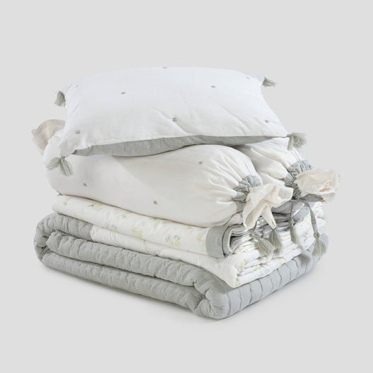 This 6-piece hand-quilted cot bedding set is made from the softest organic cotton featuring a delicate nature print. The ivory quilt stitching pattern along with the embroidered woven soft tucks and bows makes it the perfect addition to any Nursery. The reversible pillow cover has soft-dyed tassels on all four sides. It comprises of one pillow (insert included), 2 bolsters (inserts included), one quilt, one dohar and one bedsheet. We have included a non-fitted bedsheet to fit any cot mattress.