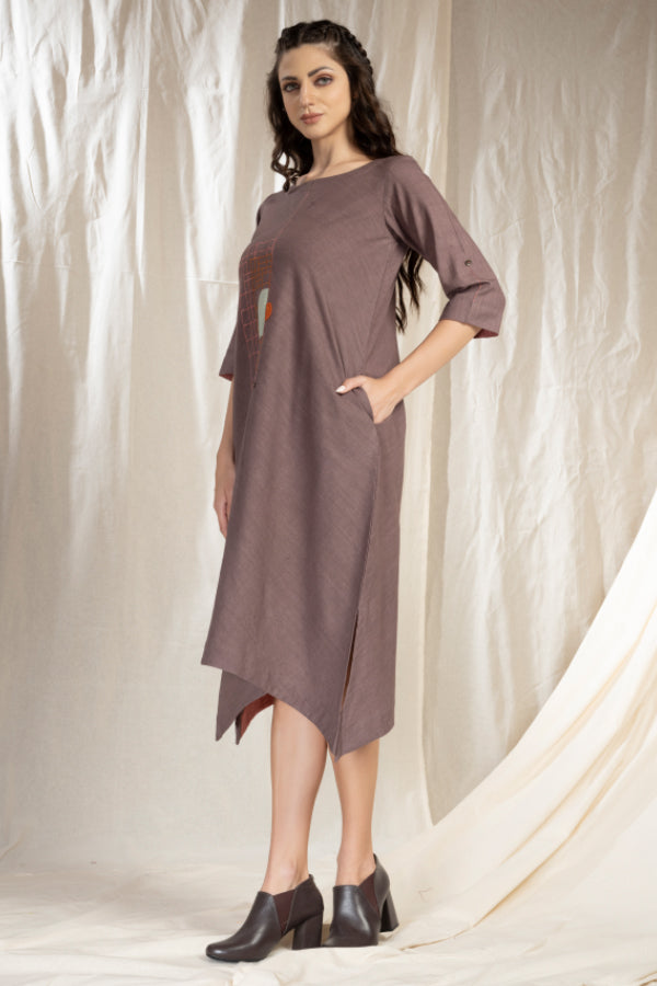 This product preserves India’s rich history in textiles as it is made from hand spun and hand woven khadi. Local artisans put in their all like the gentle embroidery highlighted on the piece. Captivate everyone’s attention with the exquisite Applique Artistry – Artisan made Relaxed Fit Dress. This masterpiece showcases unparalleled hand applique artistry on the front and back of the dress, complemented with a 3/4 roll-up sleeve and an asymmetrical hem. The elegance of hand applique is offset by the contemporary cut of the dress, which includes an asymmetrical hem and stylish roll-up 3/4 sleeves. The Hand Woven - Hand Spun Khadi Applique Dress is perfect for an evening out or for anyone looking to introduce artisanal appeal to everyday attire.