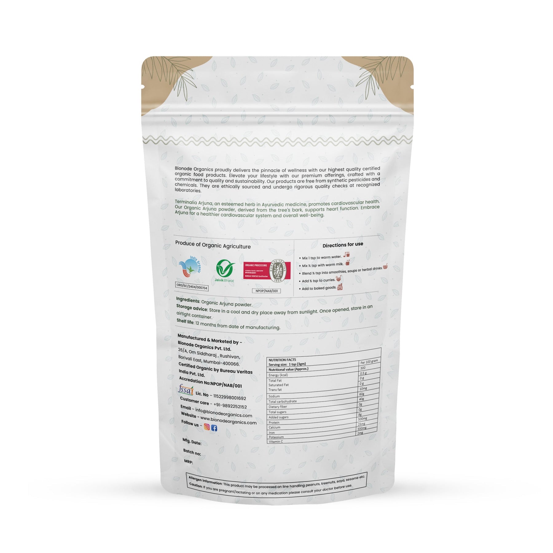 Bionode Organics Arjun ki Chaal Powder is Certified Organic Arjuna Powder For Men & Women- To Support Heart Health & Promote Good Cholesterol and Ayurvedic Supplement for Liver Health, Digestive Health & Cardiovascular Support For Vitality proudly presents its certified organic Arjuna powder, sourced from the bark of the Terminalia arjuna tree cultivated in certified organic farms. With a rich history rooted in Ayurvedic tradition, Arjuna holds significant importance as a revered herb known for its potential health benefits. This botanical treasure is celebrated for its cardiovascular support, aiding in regulating blood pressure levels and promoting overall heart health. Packed with essential nutrients including vitamins, minerals, tannins, flavonoids, and saponins, our Arjuna powder embodies the purity of nature’s bounty. Certified organic and free from synthetic substances, it upholds our commitment to delivering premium quality and holistic wellness naturally. Experience the profound benefits of Arjuna in its purest form with Bionode Organics’ certified organic Arjuna powder.