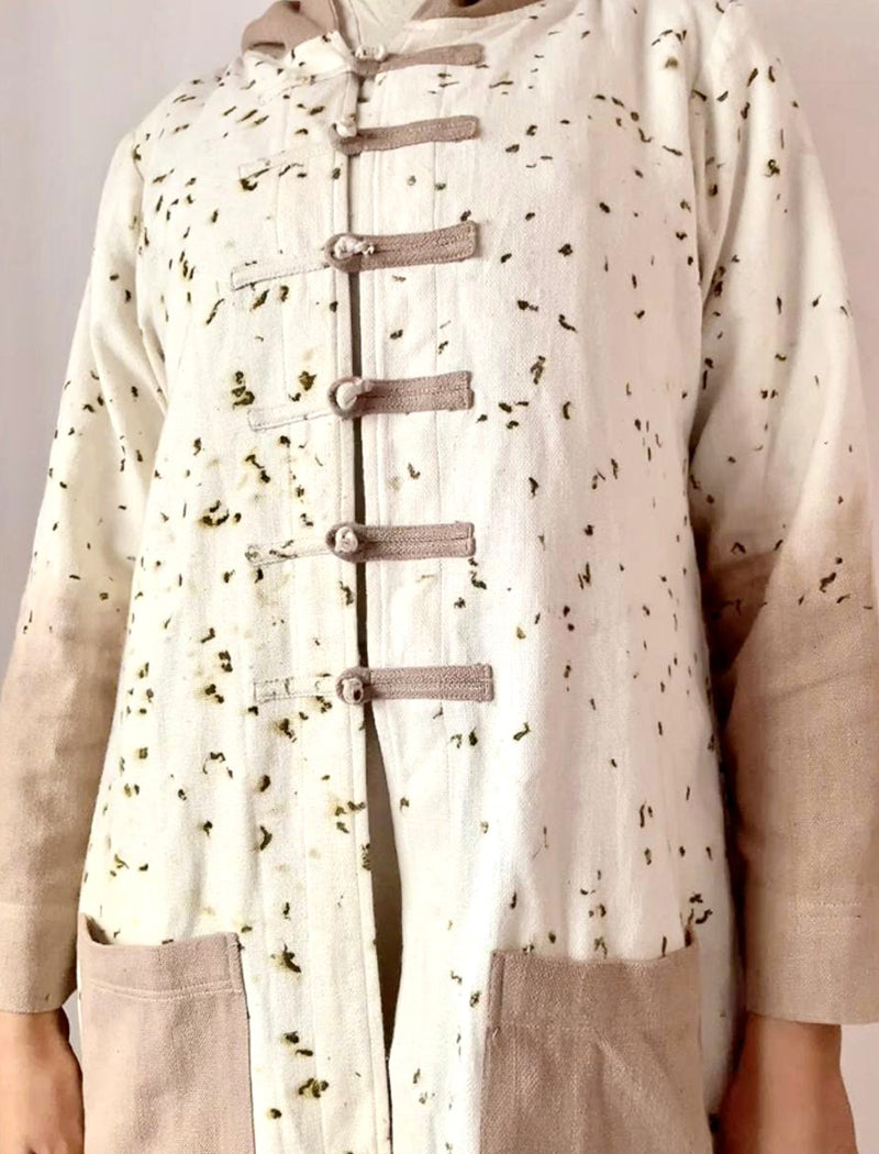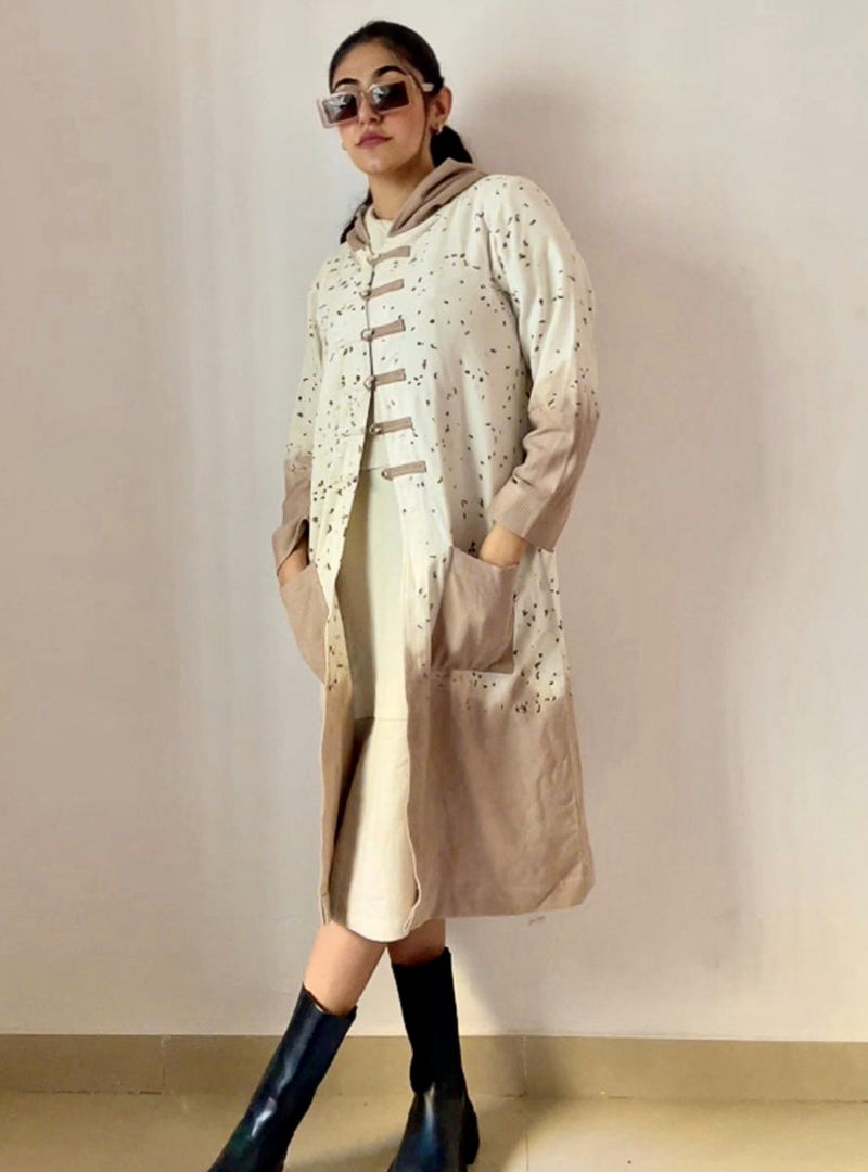 Our full-sleeved long shrug with a hood and pockets is crafted from handloom organic khadi fabric, naturally ombre dyed and printed with delicate petals.​​​​​​​​