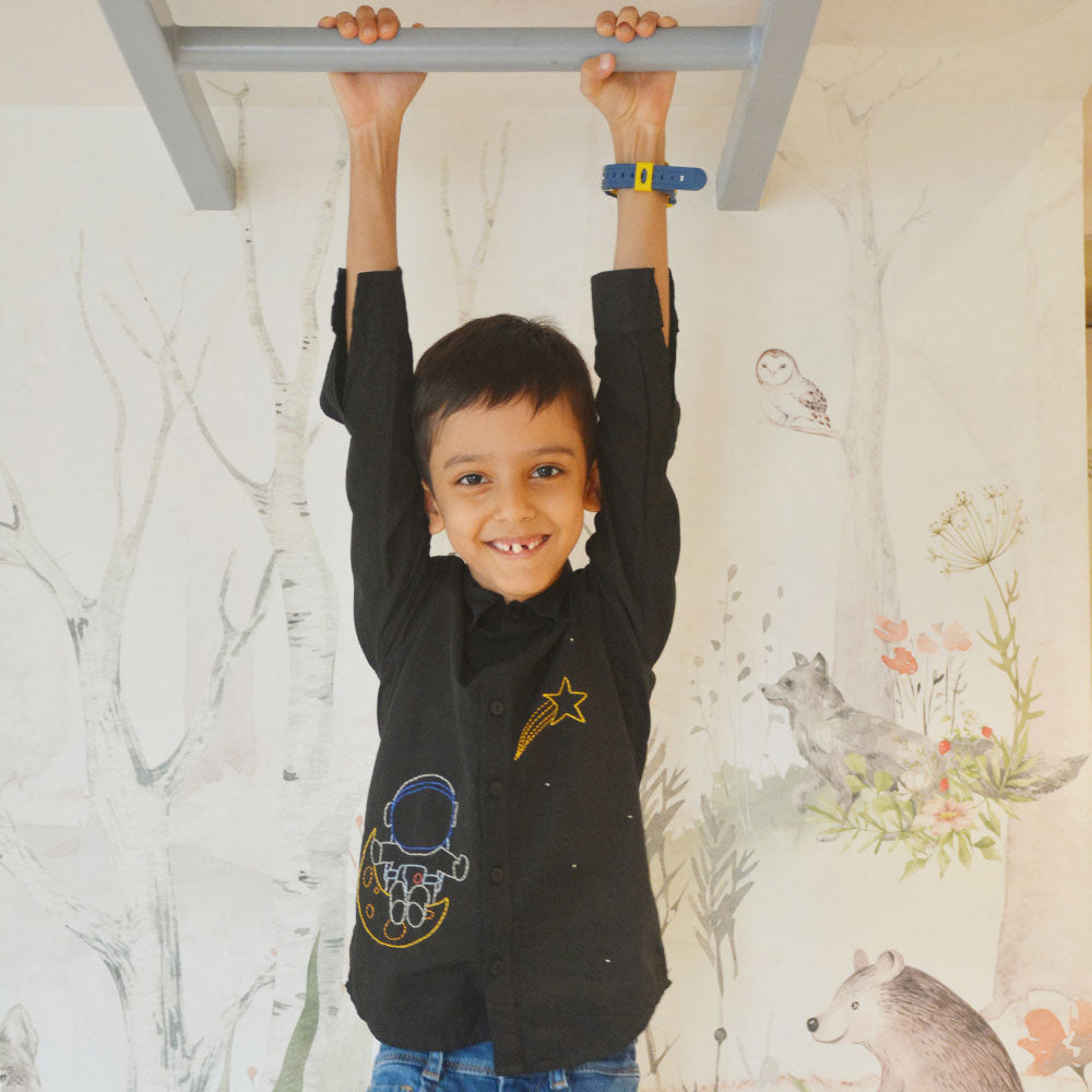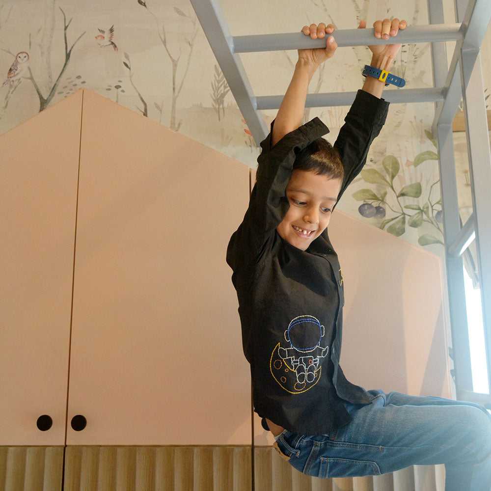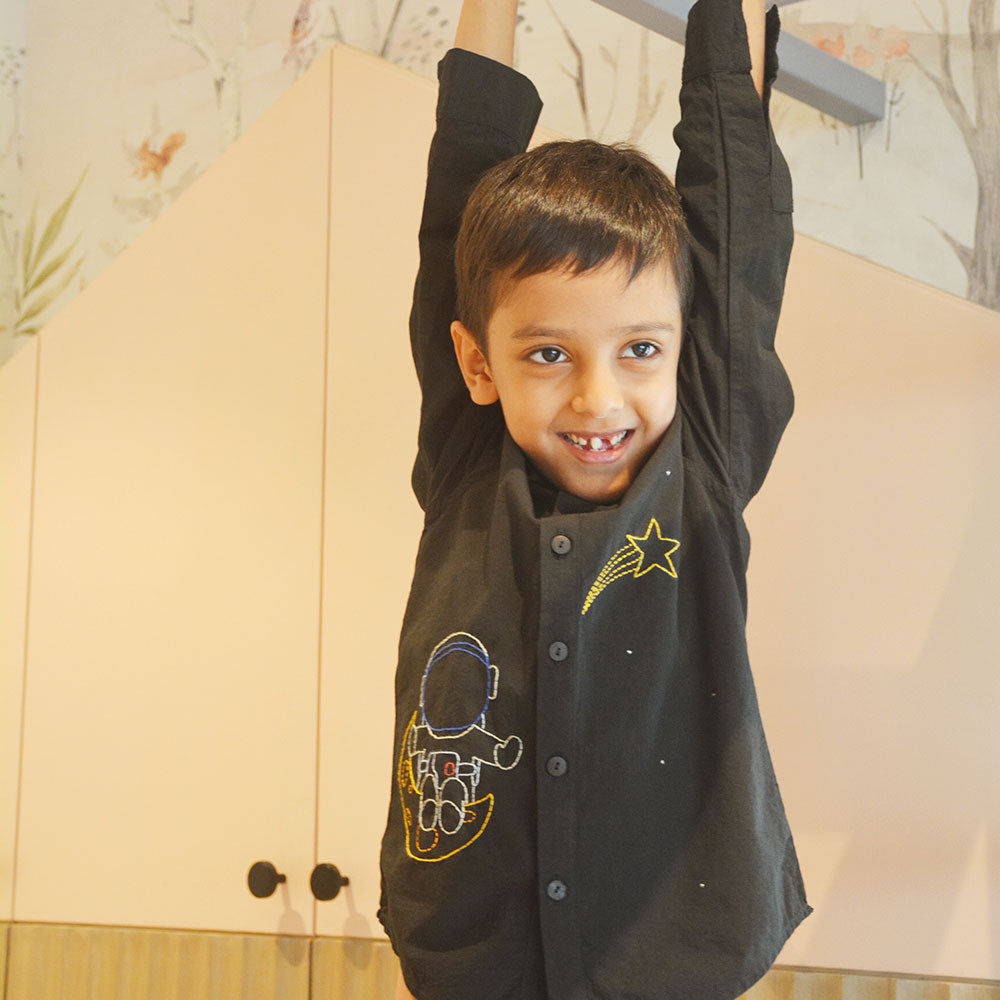 Soar high like an astronaut! A space themed shirt in classic black for your handsome little one to dream high in! Stylize it with trousers, or roll up the sleeves & team it with denims or shorts for a smart-casual look. Made from high-quality, breathable organic cotton fabric, this shirt ensures comfort for your child.ξ