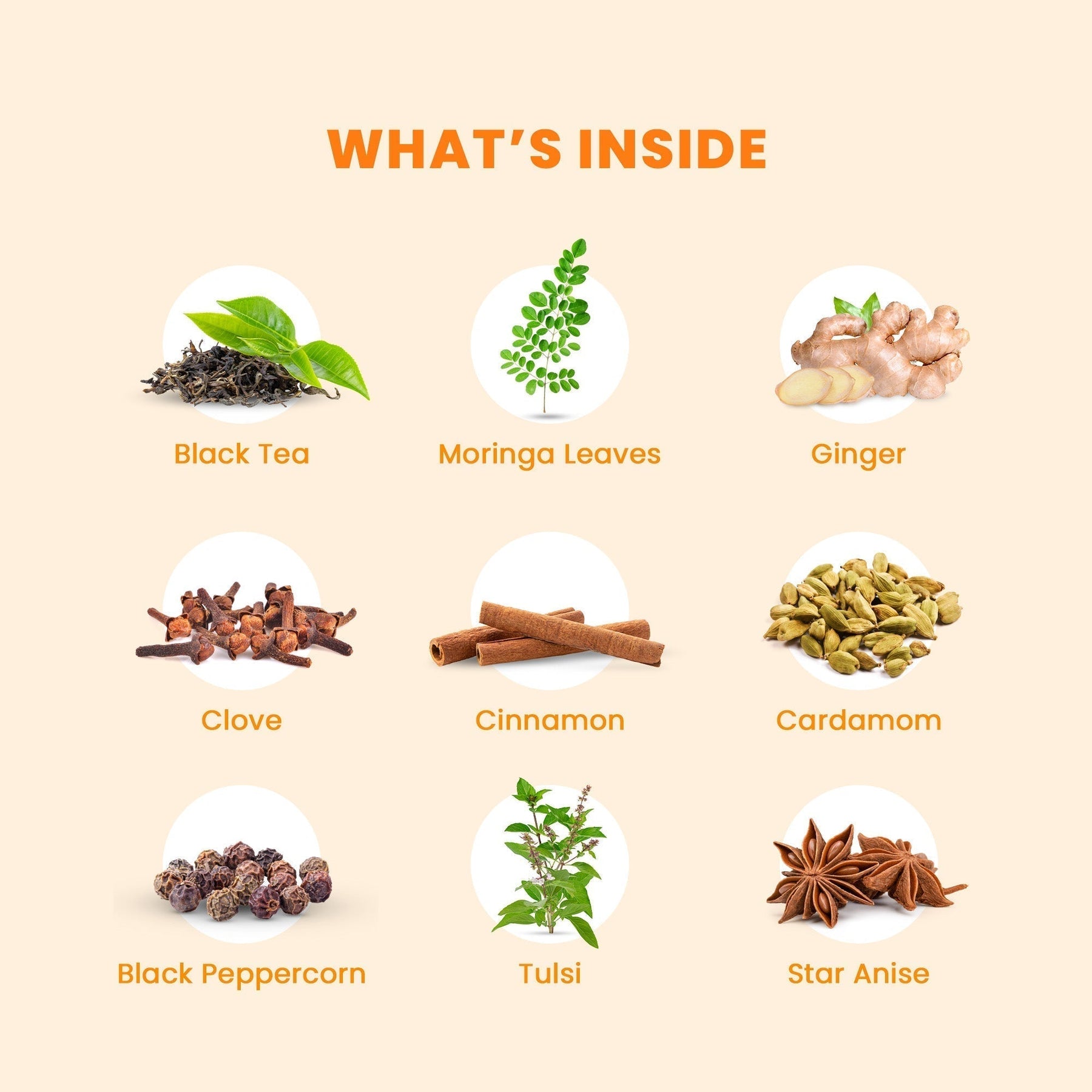 MORINGA BENEFITS: 1 Cup of Auric Masala Chai takes care of 20% Daily Intake of Moringa. Moringa is known for powerful vitamins & minerals. It is also known as natural immunity boosters with rich source of antioxidants which are great for skin, hair and a healthy body