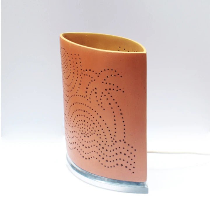 "AYE" : very finely touched EYE shaped design with curved surface at front & back - and with light it is very much like a storyteller because of the perforated design with an artistic touch which play well with lights along with the dreamy presence. It is a terracotta decorative table light for any decor - modern, retro or even little classy fashion : this will glow with its own beauty as table lights. This Light can easily go on tables like TV table, corner table, Bedside table or any place where you wish to have a elegance by play of light and light itself. The product is designed to give you indirect light without hitting your eyes.