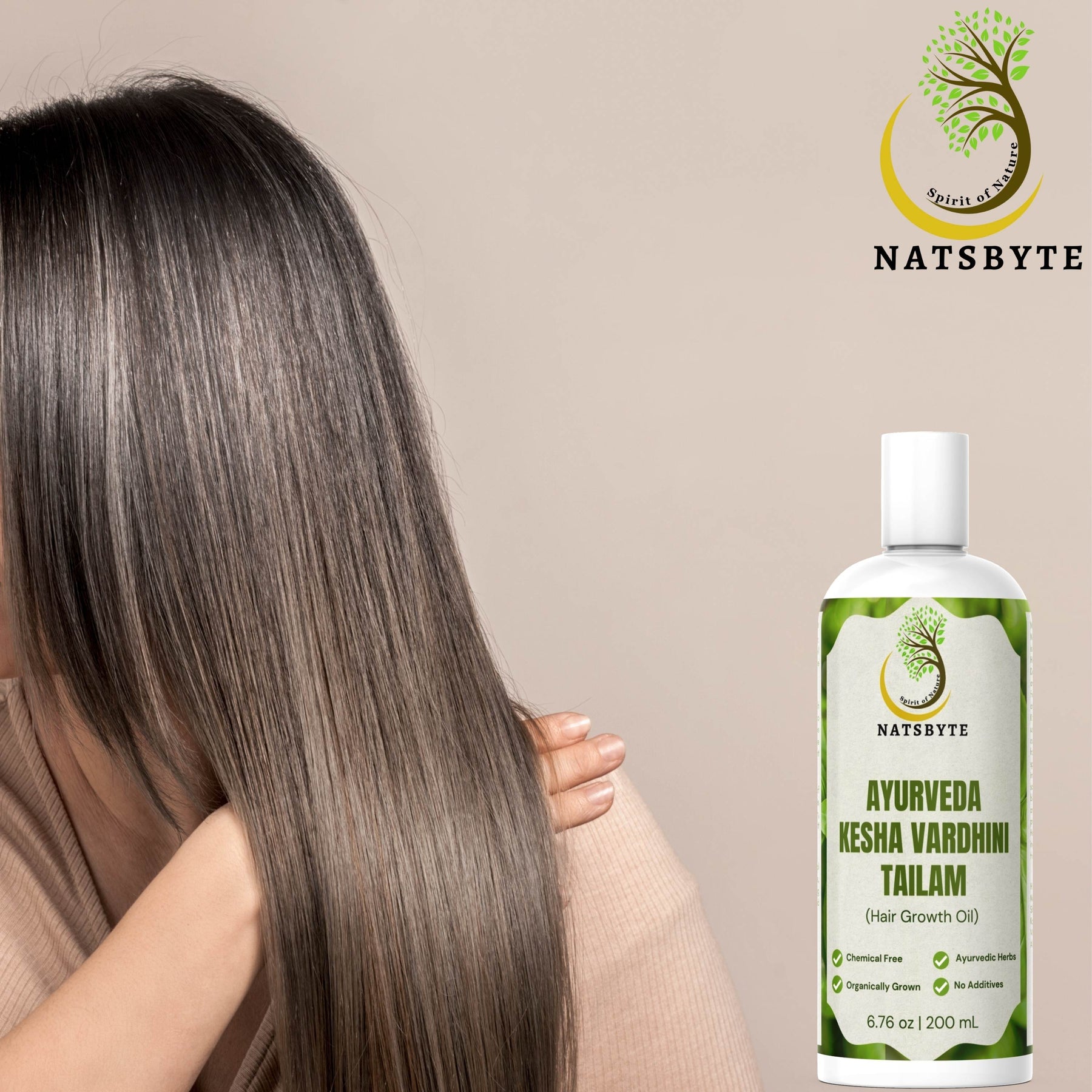 **Natsbyte Ayurveda Keshvridhi Tailam** is a powerful herbal hair oil formulated to promote **hair regrowth, reduce hair fall, and nourish the scalp**. Enriched with potent Ayurvedic ingredients like **Bhringraj, Amla, Brahmi, and Neem**, it strengthens hair follicles, enhances blood circulation, and prevents dandruff. This **non-sticky, lightweight oil** deeply penetrates the scalp, restoring natural shine and vitality. Regular use helps in **reducing premature graying**, controlling frizz, and improving hair texture. Free from harmful chemicals, **it suits all hair types** and is perfect for those seeking a **natural, Ayurvedic solution** for strong, thick, and healthy hair.