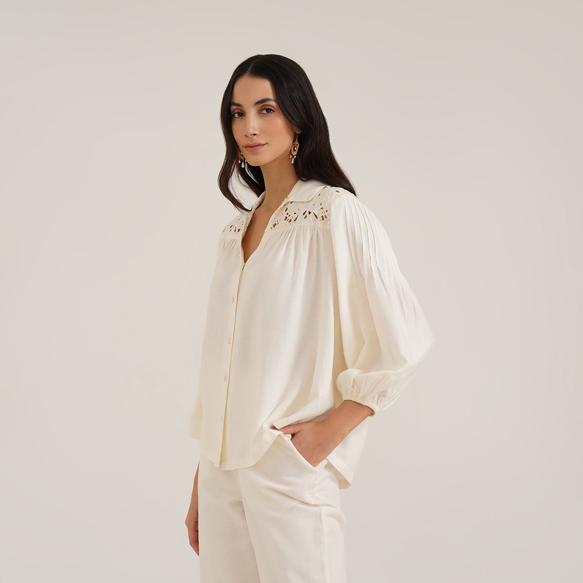 B77 HEKA Stylish Women's Linen Shirt with Cutwork Embroidery