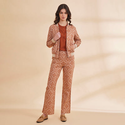 B77 NOORAT Burnt Orange Printed Women's Bomber Jacket with Zipper