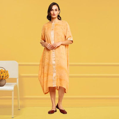 Immerse yourself in luxury with our handcrafted cowl dress. The unique dyeing process involves marigolds and manjishta by our trained artisans. We gather flowers from local temples, not just for their vibrant hues but also to contribute to reducing marine pollution. This sustainable approach ensures a dress that not only looks and feels exceptional but also aligns with eco-conscious values.Our Aamrapali cowl dress is a canvas of creativity, featuring a stunning pattern with beel patra in the center and marigolds on the sides.