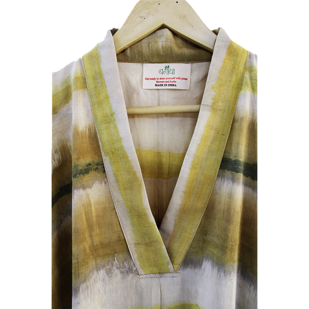 Our Aranya Kimono Tunic is made from h Khadi Tussar cotton, sourced directly from local weavers of Bihar. This fabric is known for its luxurious feel, breathability, and natural drape. We embrace eco-conscious practices by dyeing the fabric with Harada and Amba Haldi, natural alternatives to harmful chemical dyes. These readily available resources not only create beautiful colors but also help reduce marine pollution, a vital step towards environmental responsibility. Inspired by the classic Kimono style, this tunic features a flattering V-neckline that elongates the silhouette.