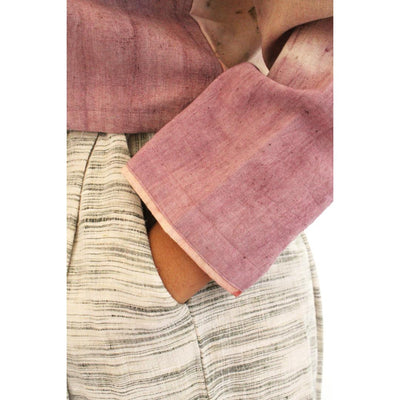 Bageeya's "Ayur " blouse is crafted from Khadi organic cotton, handwoven by skilled artisans and dyed with natural elements like Lac, Marigold, Beel patra. This sustainable and luxurious piece embodies cultural charm and timeless style. The Rekha blouse is dyed using a unique and sustainable process. We use only Sacred temple flowers like Lac, Marigold, Beel patra , eliminating the use of harmful synthetic dyes that contribute to marine pollution.