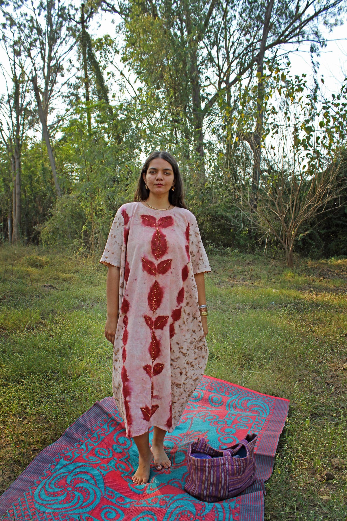 Bageeya's “Baag Bahar” cowl dress elevates your wardrobe, a masterpiece of artistry. Made from Khadi organic cotton sourced from Kutch weavers, dyed with Marigolds and beel patra, this dress is a testament to skilled craftsmanship. Intricate detailing, including French knots on beel patra leaves and rudraksh-adorned sleeves, enhances its allure.