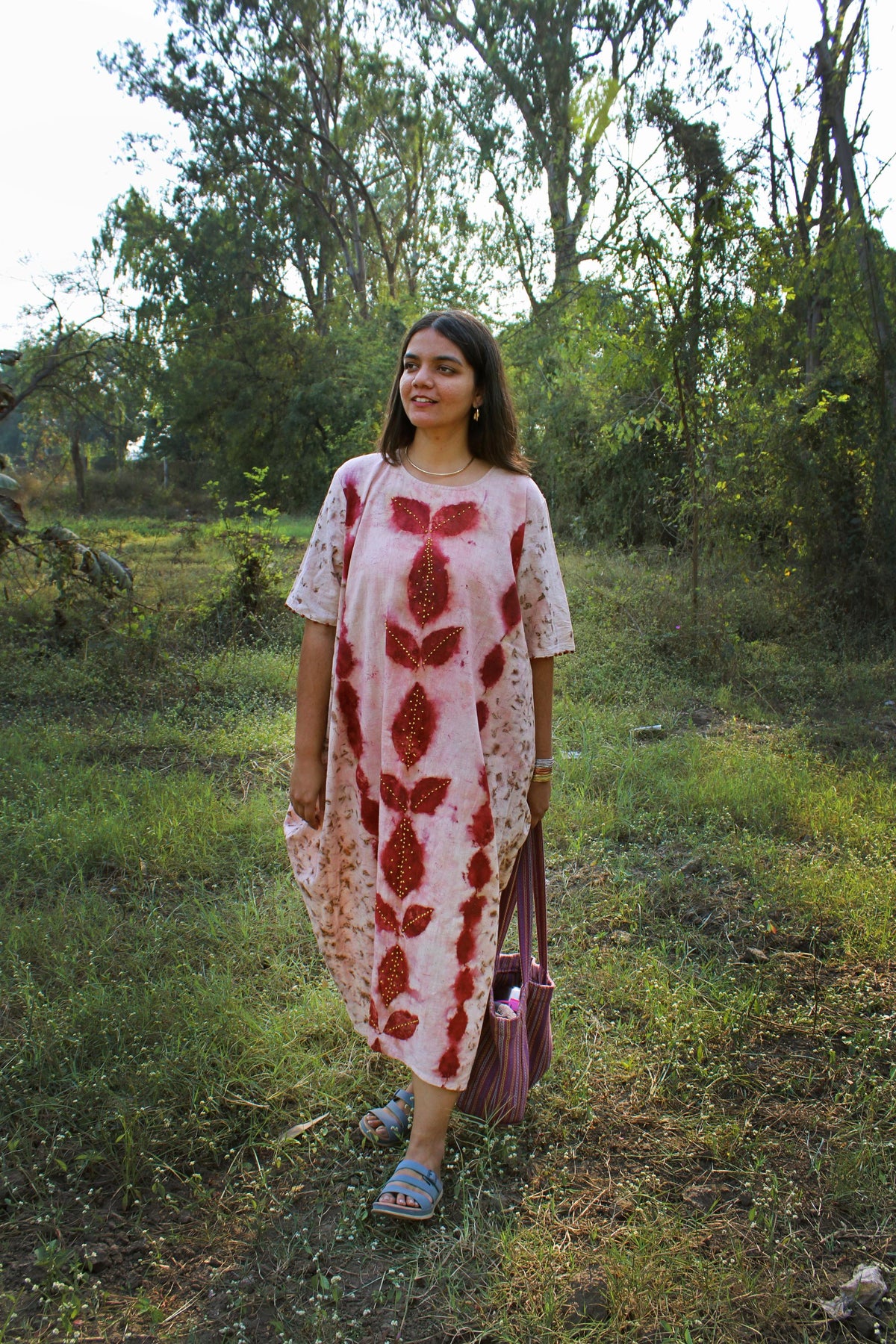 Immerse yourself in luxury with our handcrafted Baag Bahar cowl dress, crafted from locally sourced, handwoven organic cotton from Kutch. The unique dyeing process involves marigolds and beel patra infused with manjishta by our trained artisans. We gather flowers from local temples, not just for their vibrant hues but also to contribute to reducing marine pollution. This sustainable approach ensures a dress that not only looks and feels exceptional but also aligns with eco-conscious values.