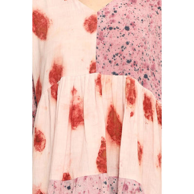 "Bageeya's ""Comet,"" a whimsical tiered dress with a V neckline, mandarin collar, and balloon sleeves adorned with intricate gold zari detailing. Handwoven from organic cotton sourced in Bihar, and dyed with Manjistha-infused beel patra, lac, and indigo. The dreamy splatter print, inspired by sacred temple flowers, gives this dress a charming yet elegant allure. Crafted with care, ""Comet"" embodies a fusion of nature and artistry. Its organic cotton is handwoven by local artisans in Bihar and dyed using a unique blend of Manjistha-infused beel patra, lac, and indigo. Sacred temple flowers are collected to create a sustainable dye, reducing marine pollution. This thoughtful process ensures a dress that not only celebrates craftsmanship but also echoes an eco-conscious ethos, connecting wearers to the beauty of nature and tradition. ""Comet"" is a masterpiece of design, featuring a V neckline, mandarin collar, and two-tiered layers that create a playful silhouette. The balloon sleeves, detailed with exquisite gold zari fabric, add a touch of opulence. The dress showcases a dreamy splatter print achieved through a meticulous dyeing process with lac, and indigo. The fusion of traditional craftsmanship and contemporary style makes ""Comet"" a unique and elegant choice for those who appreciate artistry in fashion. Elevate your style with ""Comet"" by pairing it with strappy sandals and minimal accessories for a day out. For an evening affair, add our statement obi belt to accentuate the silhouette. The dress effortlessly transitions from casual to chic, making it a versatile and must-have piece for any wardrobe So, slip into this versatile Tiered dress and feel confident knowing you look good and do good! " " XS-M: Length 34.1” Armhole 16.6” Sleeve length 19” Bust round 37” Waist round 36” Hem round 93.4” "L-2XL: ""Length 34.1” Armhole 18.6” Sleeve length 20” Bust round 41” Waist round 40” Hem round 97.2” """ Care Instructions:Hand wash with ph neutral mild detergents. Machine wash using gentle cycle. Low temperature/keep cloth over the garment to iron. Do not bleach. Keep cloth over the garment to iron. Dry flat. Avoid direct sunlight. Use ph-neutral soap.