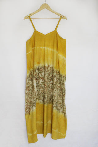 Bageeya's ''Daffodil'' strap dress, crafted from khadi organic cotton sourced from local artisans of Kutch, Gujarat, embodies tradition and sustainability. Dyed with sacred temple flowers and Ayurvedic herbs, this dress boasts a beautiful yellow hue obtained from Haldi. With a flowing A-line cut and ankle length, it drapes beautifully for a comfortable and elegant look. We use handwoven organic cotton, sourced directly from the skilled artisans of Kutch, Gujarat. This not only ensures the dress's quality and breathability but also supports local communities. Our commitment to sustainability extends to the dye. Instead of conventional methods that harm the environment, we use sacred temple flowers and Ayurvedic herbs. This particular dress features haldi and roses, which imparts a vibrant yellow and green from roses. By using temple flowers that would otherwise be discarded into waterways, we contribute to reducing marine pollution. The dress is designed for both comfort and style. The straps flow beautifully, offering a touch of elegance.