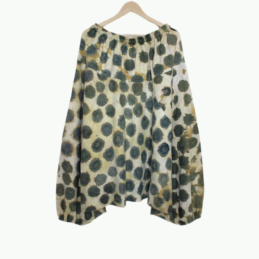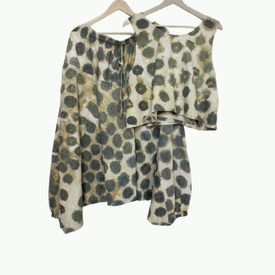 "Bageeya's "Gaia" eco-conscious set is crafted for comfort and effortless style. Featuring a playful pinafore top and harem pants, this set is crafted from h Khadi organic fabric, sourced from the skilled artisans of Kutch, Gujarat. Dyed with sacred temple flowers and Ayurvedic herbs, this unique set offers a sustainable and stylish choice for the modern bohemian. We are committed to sustainable fashion practices.