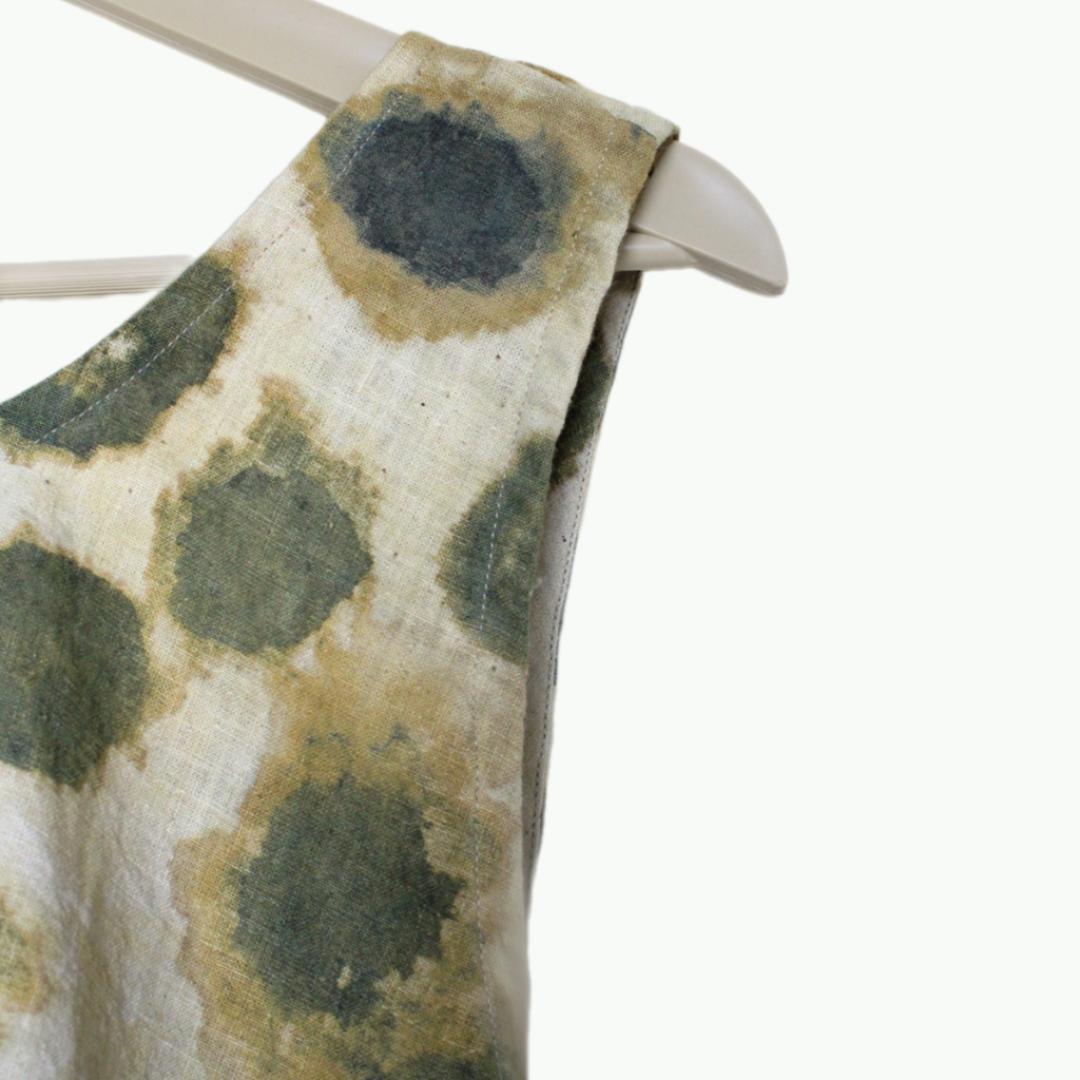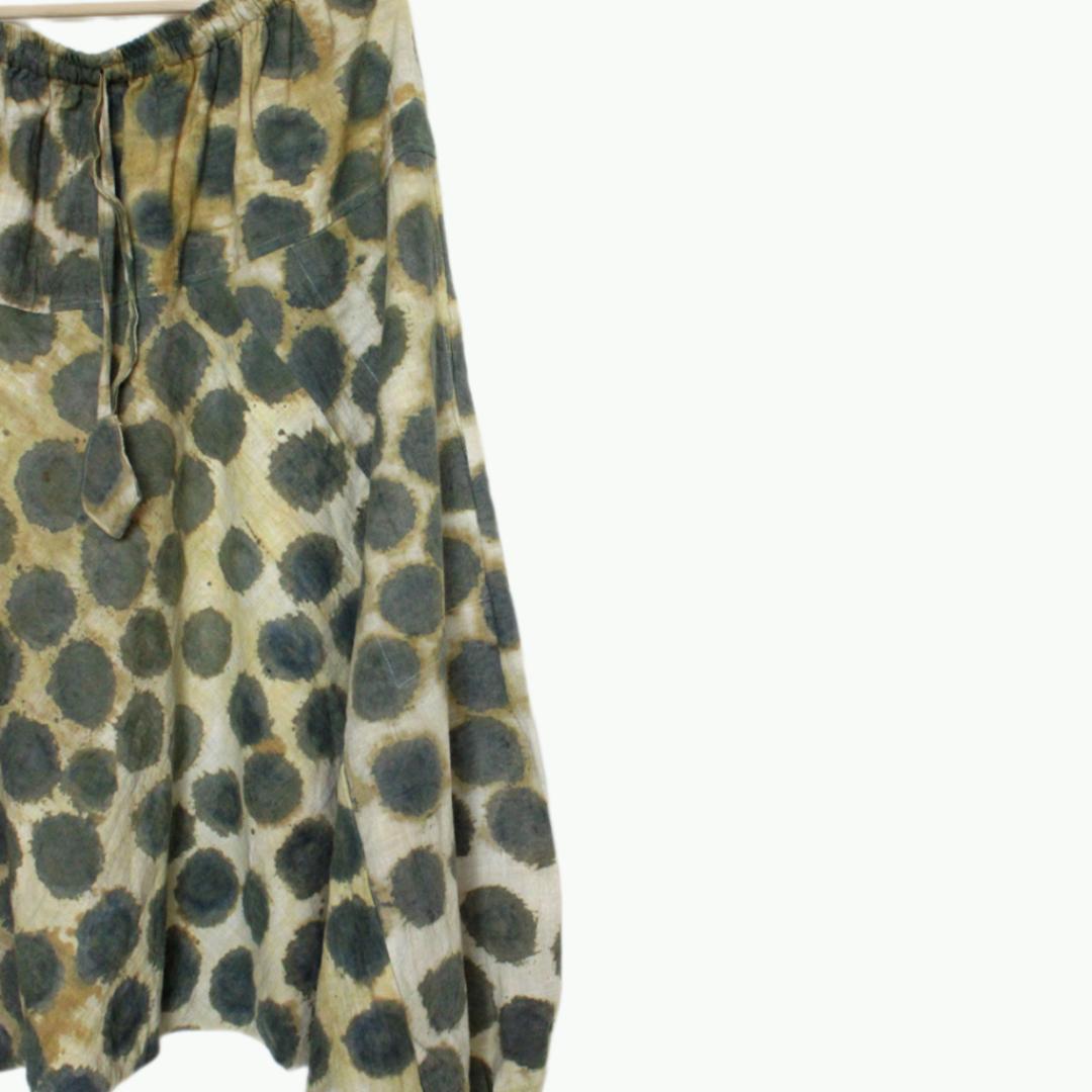 This set is made from beautiful khadi organic fabric, handwoven by local artisans from Kutch, Gujarat. We elevate the eco-conscious approach by using a unique and natural dye process. Our trained artisans hand-dye the fabric using, Ayurvedic herbs, like harda. This eliminates harmful chemicals and reduces pollution in our waterways, making this set a perfect choice for those who value both style and sustainability. This two-piece set offers a relaxed, one-size-fits-most design for ultimate comfort. The playful pinafore top features a flattering silhouette, while the harem pants provide a loose and airy fit. The natural drape of the handwoven khadi fabric creates a beautiful, effortless look, perfect for any casual occasion.