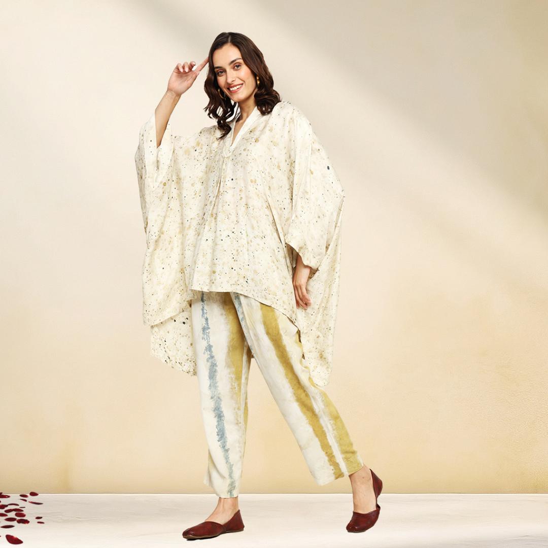 Bageeya's " Hanabi" Kimono Tunic embraces effortless style and sustainable practices. .Handcrafted from breathable, modal and dyed with Natural dyes like Indigo this eco-friendly piece embodies effortless style and sustainability. Our Hanabi Kimono tunic is made from Pure modal , known for its incredible softness and breathability. We source this fabric directly from local weavers, supporting their traditional craftsmanship. Committed to responsible practices, we use natural dyes like indigo, extracted by our trained artisans. These natural dyes are not only beautiful, but also help reduce marine pollution by replacing harmful chemical dyes.
