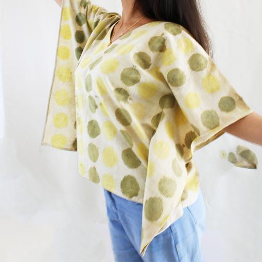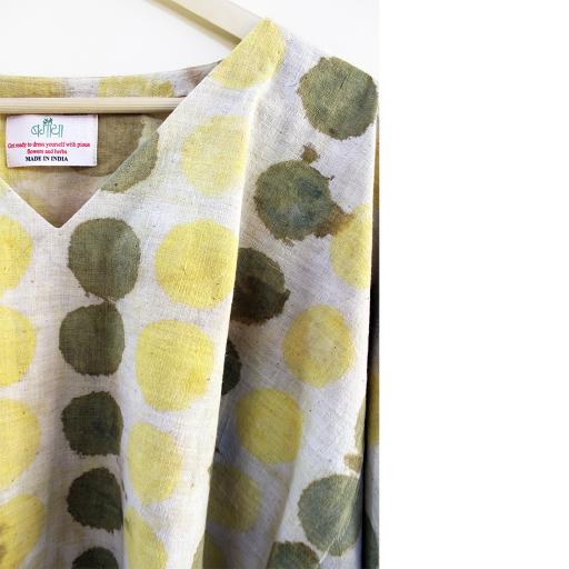 Polka dots dyed with ayurvedic herbs such as harda and amba haldi This process not only reduces waste, but also protects our delicate ecosystems. Imagine the story this top tells: a fusion of tradition, sustainability, and vibrant personality. Wearing it is a conscious choice, a celebration of nature's bounty and the skilled hands that crafted it. Made with luxuriously soft, certified organic cotton, this breezy top offers both comfort and conscious fashion. Designed in a relaxed kaftan silhouette, it drapes beautifully, flattering any figure with a loose fit and 22-inch length.