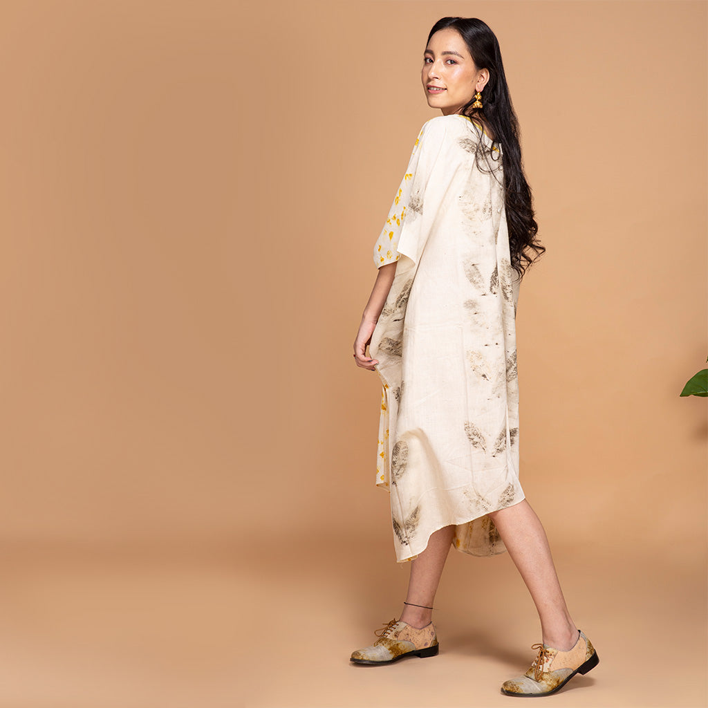 Fabric - Crafted from Khadi organic cotton sourced from Kutch, Gujarat, these dressy kurtis showcase artisanal mastery with dual designs. One side features dyed marigolds, while the other boasts eco-printed guava leaves, creating a stunning reversible piece with a flowy free size silhouette below the knee. Our Vann Kurti epitomize sustainable luxury.