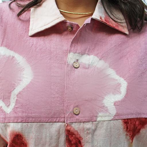 Our commitment to using temple flowers in the dyeing process stems from a desire to reduce marine pollution caused by discarded flowers. Yugen's oversized design offers a relaxed and versatile silhouette. The button-down collar adds a touch of sophistication, while the yokes on both the front and back create a visually interesting structure. This shirt is perfect for layering or wearing on its own, making it a versatile addition to any wardrobe. Yugen's versatility allows for diverse styling options.