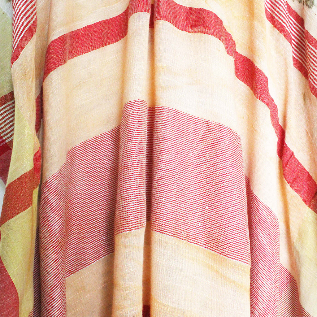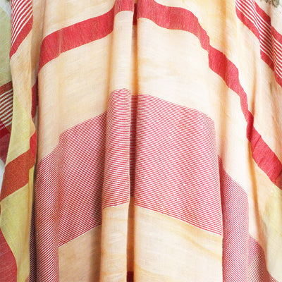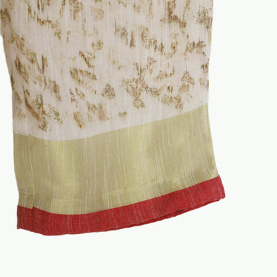 "The "Rose Glow" eco-conscious set by Bageeya is a testament to comfort and effortless style. Crafted with meticulous care, this ensemble features a flowing kaftan top and relaxed pants made from handwoven slub cotton, dyed with the essence of dry roses, and adorned with a radiant red and gold zari border. Radiating ethereal beauty, the set epitomizes elegance and sophistication, with the delicate fragrance of temple roses infusing each piece with a subtle hint of romance. Our commitment to sustainability shines through in every detail.