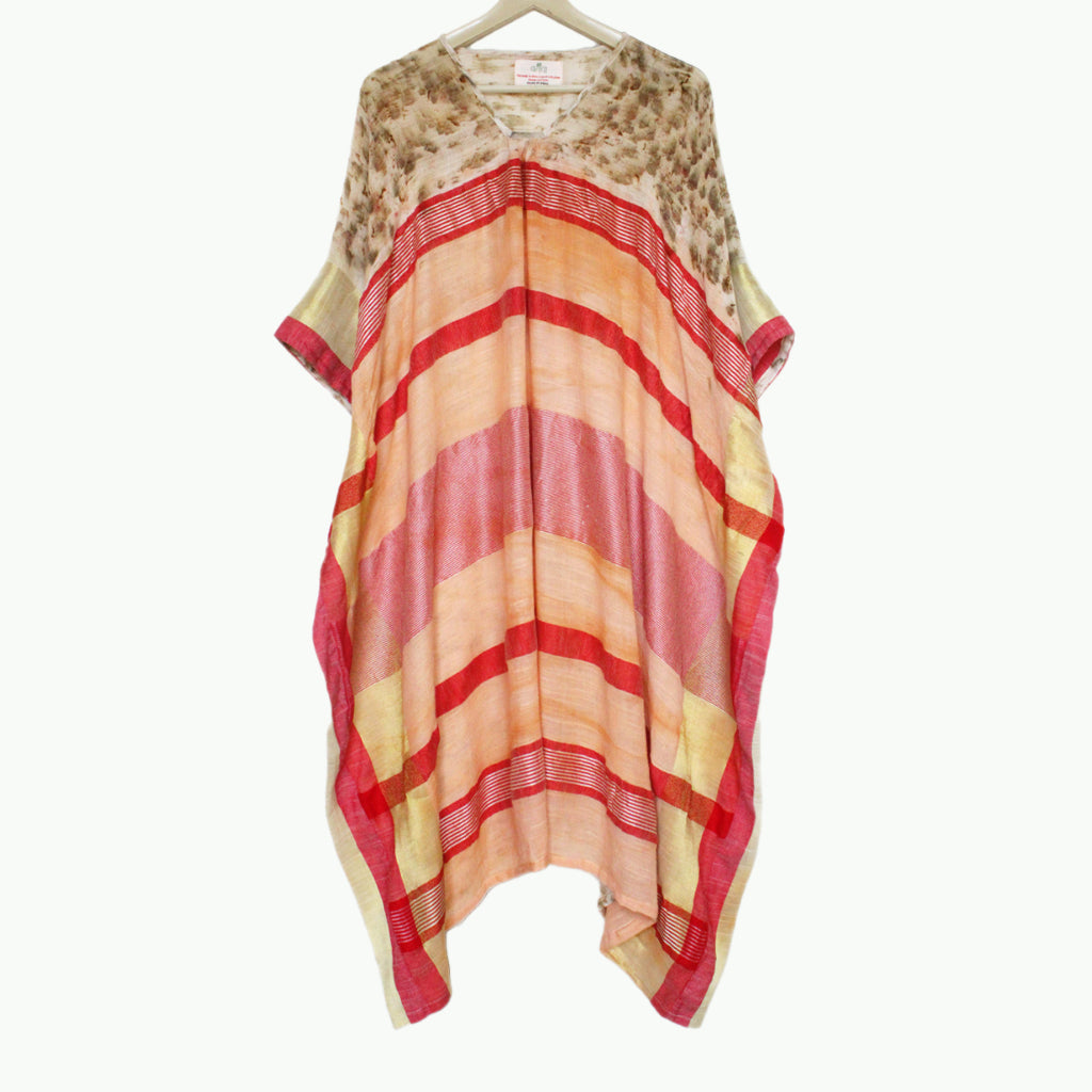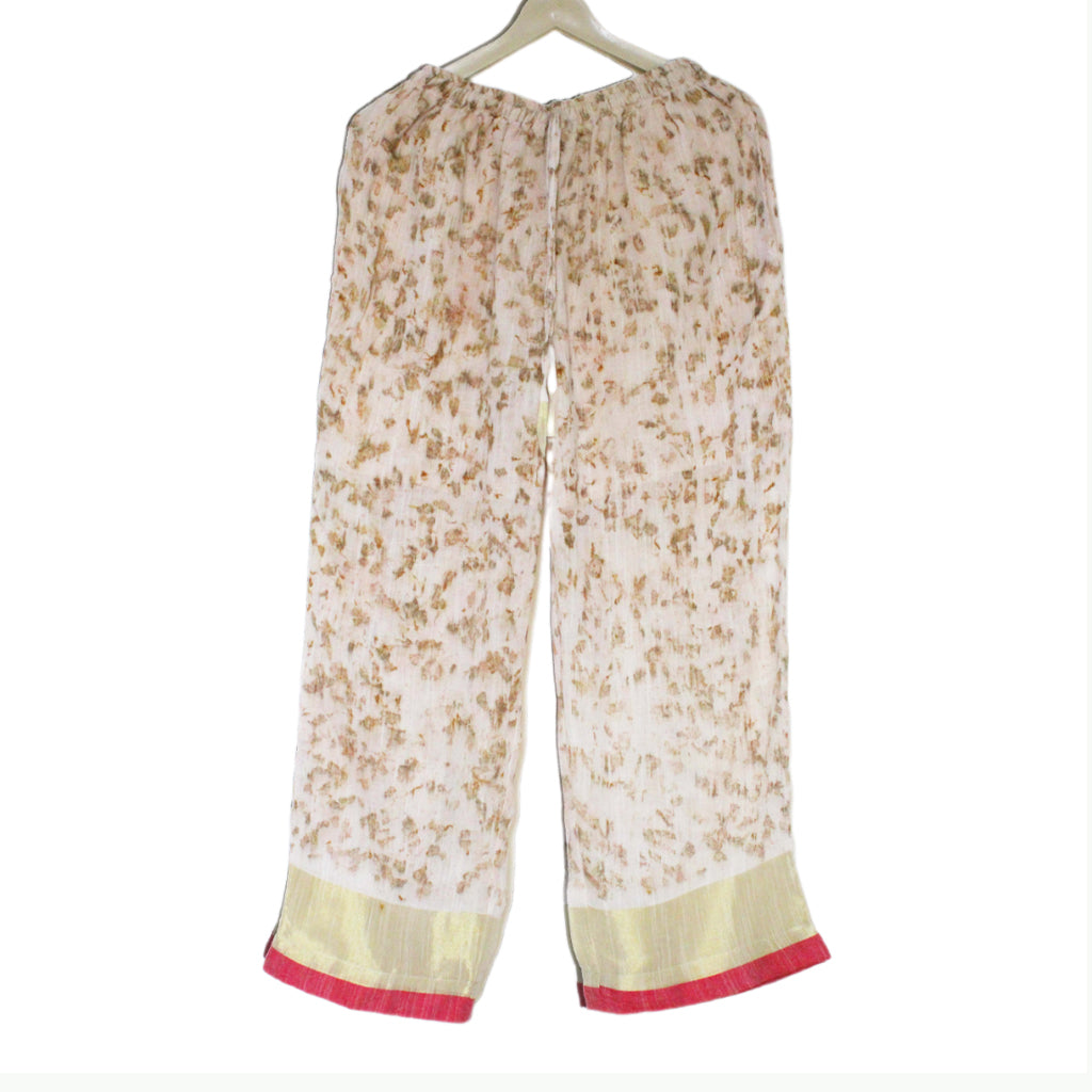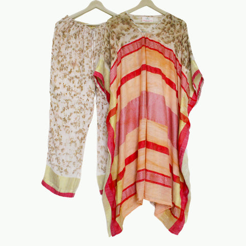 The natural dyeing process, utilizing temple roses, eliminates harmful chemicals, reducing pollution and honoring our environment. The intricate red and gold zari border showcases traditional craftsmanship, adding a touch of opulence. Embrace the versatility of this ensemble as it adapts effortlessly to your mood and style. The kaftan top offers a relaxed silhouette, while the pants provide flattering drape and ease of movement. Whether lounging at home or attending a special event, this set exudes sophistication and grace. Pair the kaftan top with a simple tee and sandals for a casual outing or accessorize with statement jewelry and heels for an evening event. No matter the occasion, the ""Rose Glow"" set is destined to become a cherished addition to your wardrobe, embodying ethereal elegance and sustainable fashion."