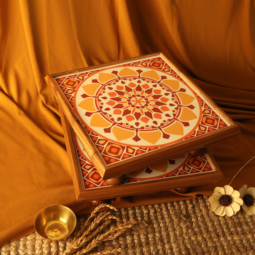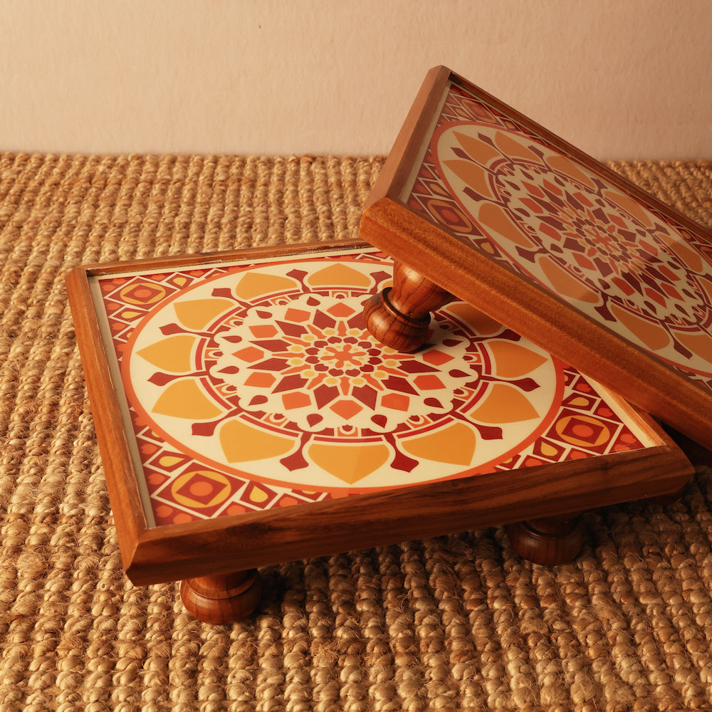 Elevate your religious ceremonies and special occasions with our Medium Mandala Bajot. This wooden bajot has an intricate mandala design, adding a touch of elegance to your rituals. With four strong legs and a thick base, it offers exceptional sturdiness, making it the perfect chowki for all your poojas and festivals. Measuring 28 cm x 28 cm, its medium size fits seamlessly into modern interior spaces, ensuring versatility and functionality for all your ceremonial needs.