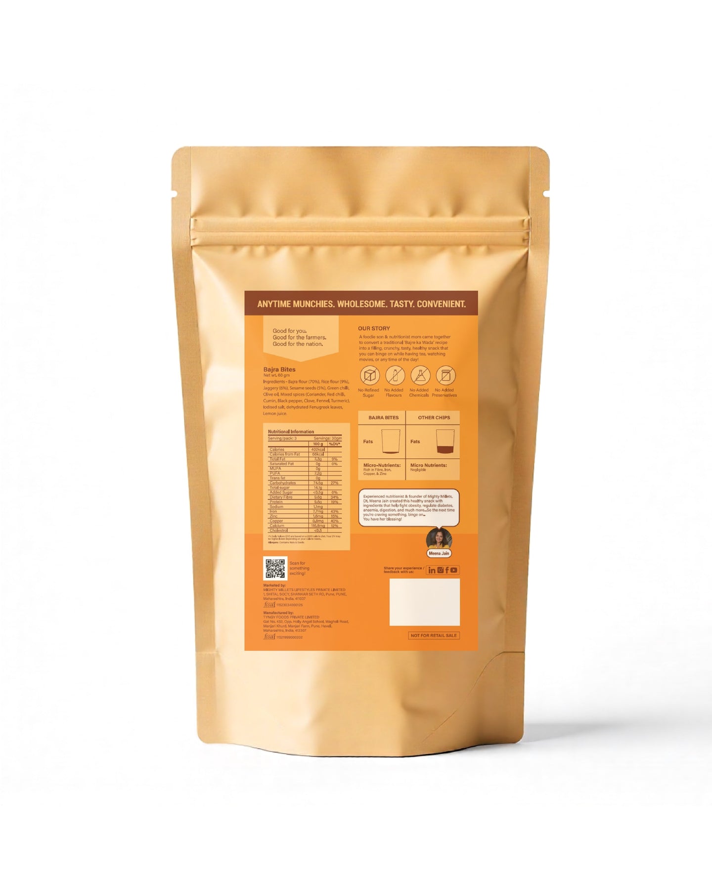 Ingredients: Bajra flour (70%), Rice flour (9%), Jaggery (6%), Sesame seeds (5%), Green chilli, Olive oil, Mixed spices (Coriander, Red chilli, Cumin, Black pepper, Clove, Cinnamon, Fennel, Turmeric), Iodised salt, dehydrated Fenugreek leaves, Lemon juice.